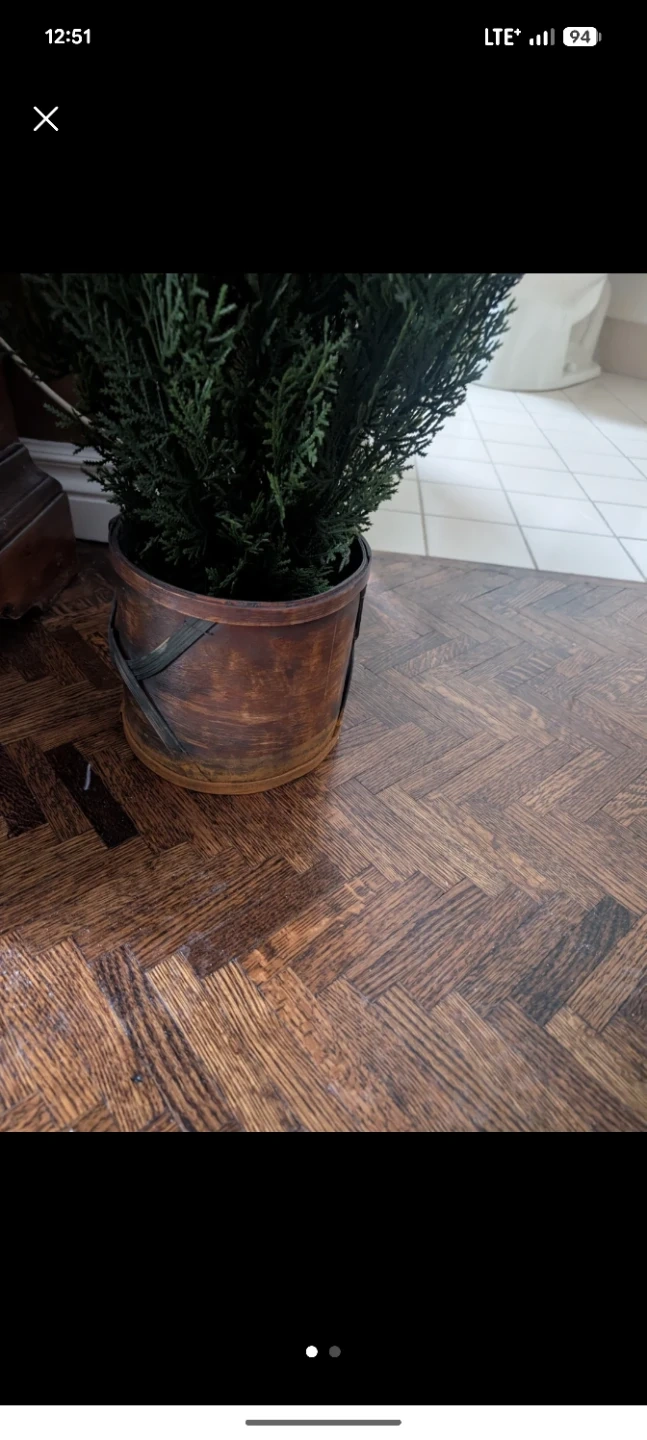 A decorative artificial cedar tree in a rustic wooden bucket planter. It's a great piece for adding some greenery indoors. The planter is made of wood with metal accents.