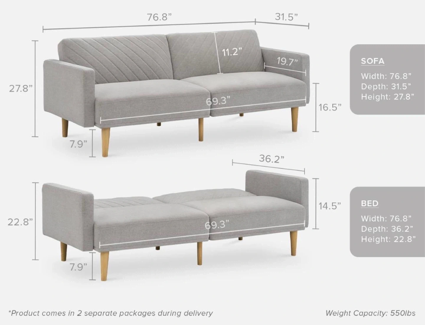 This beige fabric sofa easily converts into a bed. It features a diamond-stitched backrest for added style. Sofa dimensions: 76.8" W x 31.5" D x 27.8" H; Bed dimensions: 76.8" W x 36.2" D x 14.5" H.