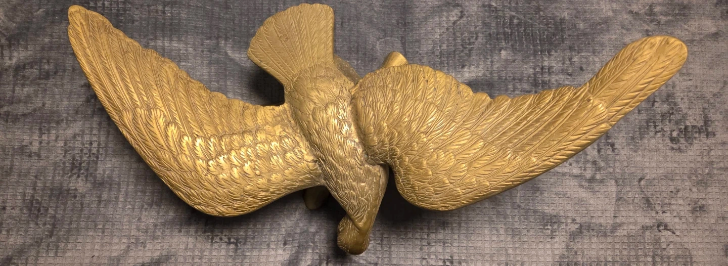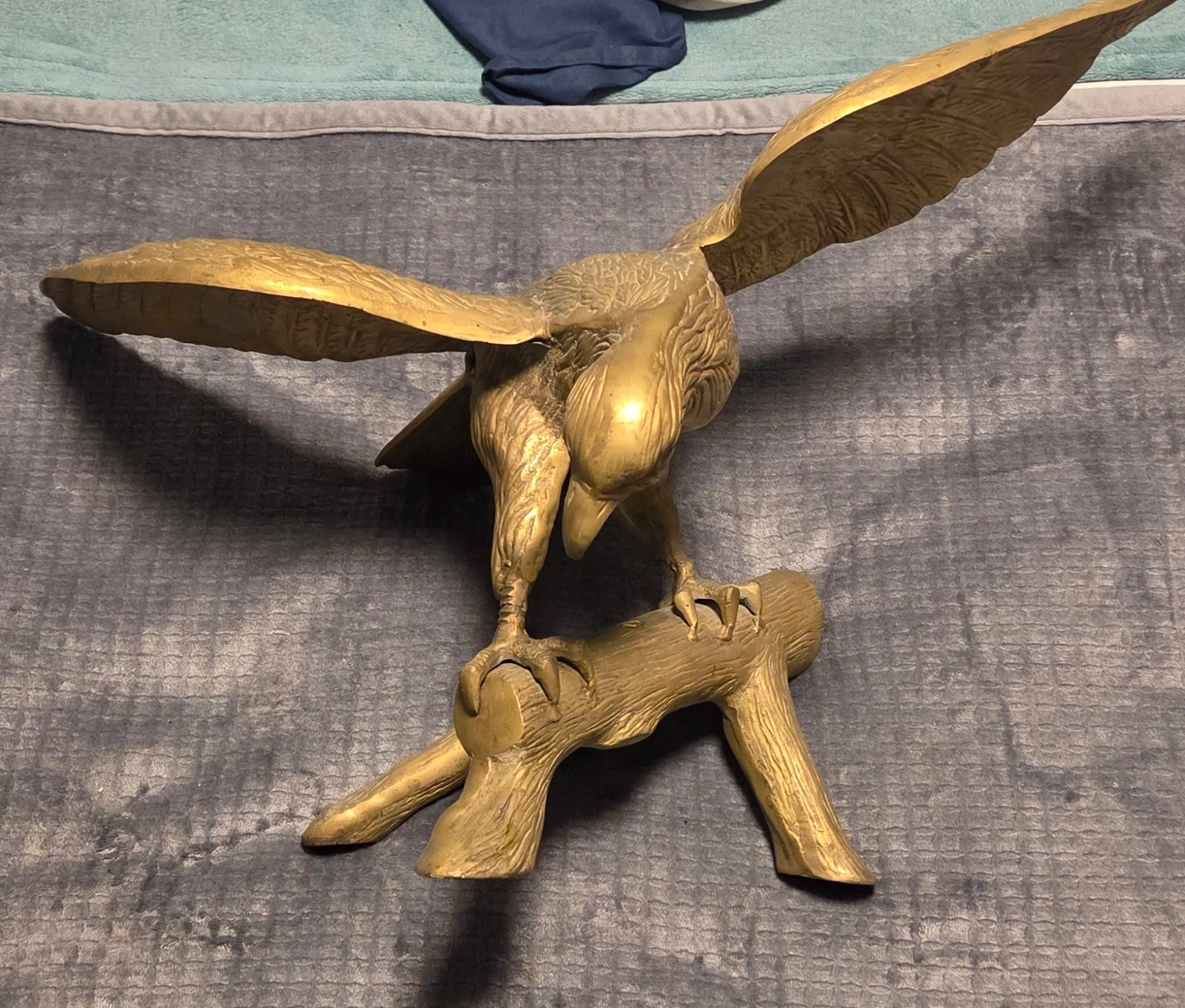 This is a yellow brass statue of an eagle. It stands on a log base, showcasing intricate feather details. It's a substantial piece for decor. It is 26 inches x 14 inches and about 10 pounds heavy.