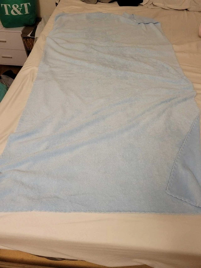 Snuggle your little one in this pre-loved, but still in good condition, 63"x29" baby throw! It's perfect for adding an extra layer of warmth in the stroller or for cozying up at home. It's a soft, light blue colour. If the ad's still up, then yes, it's still available!