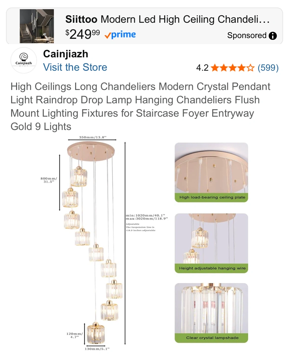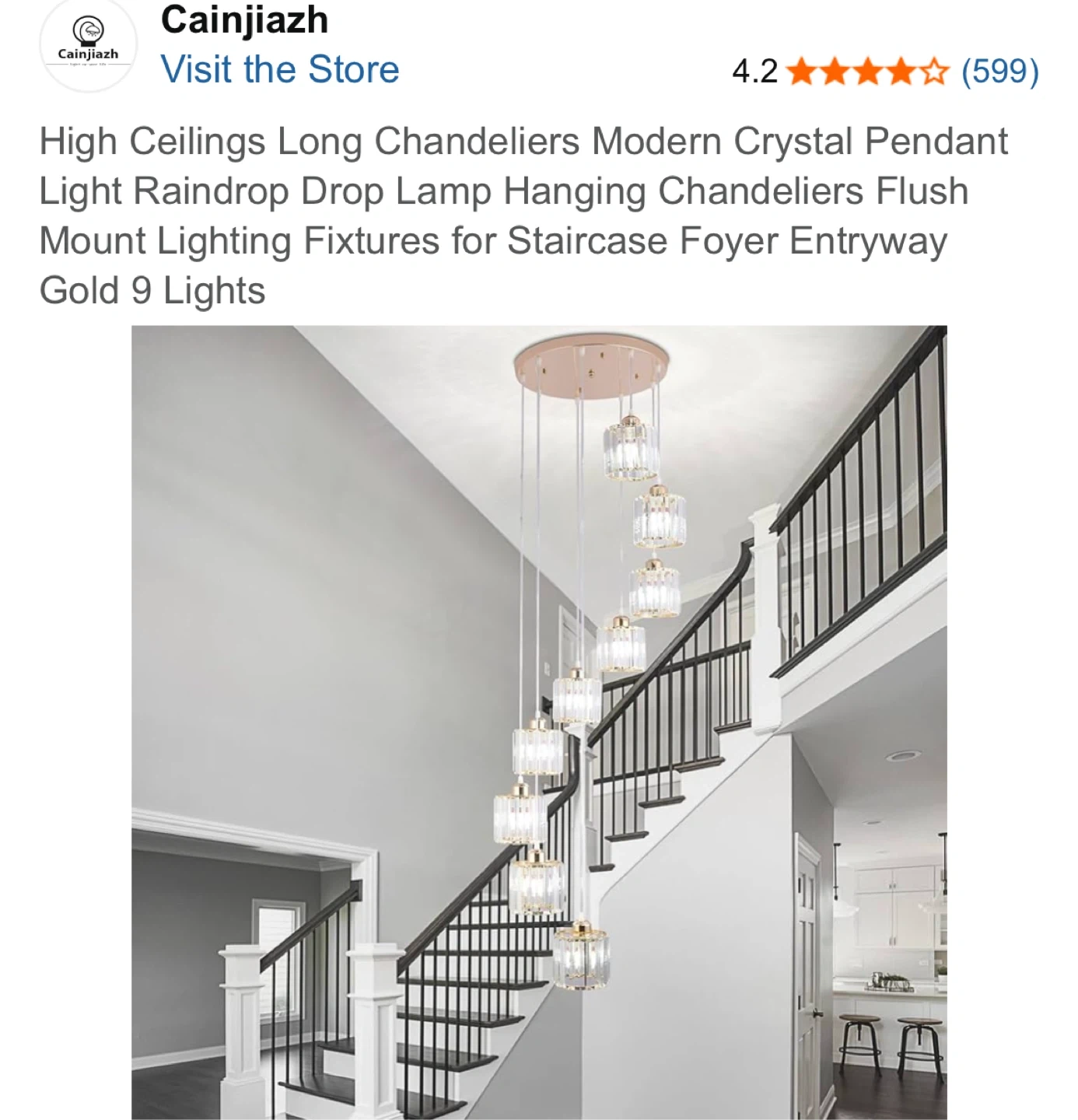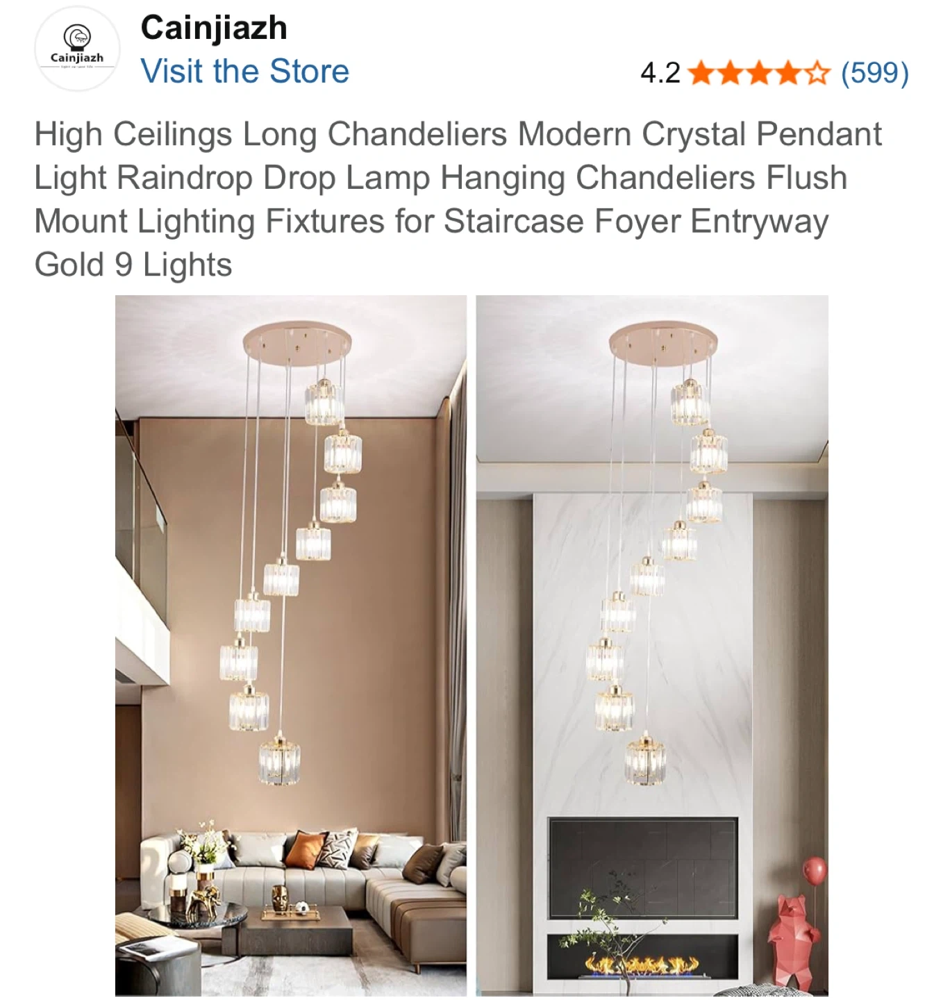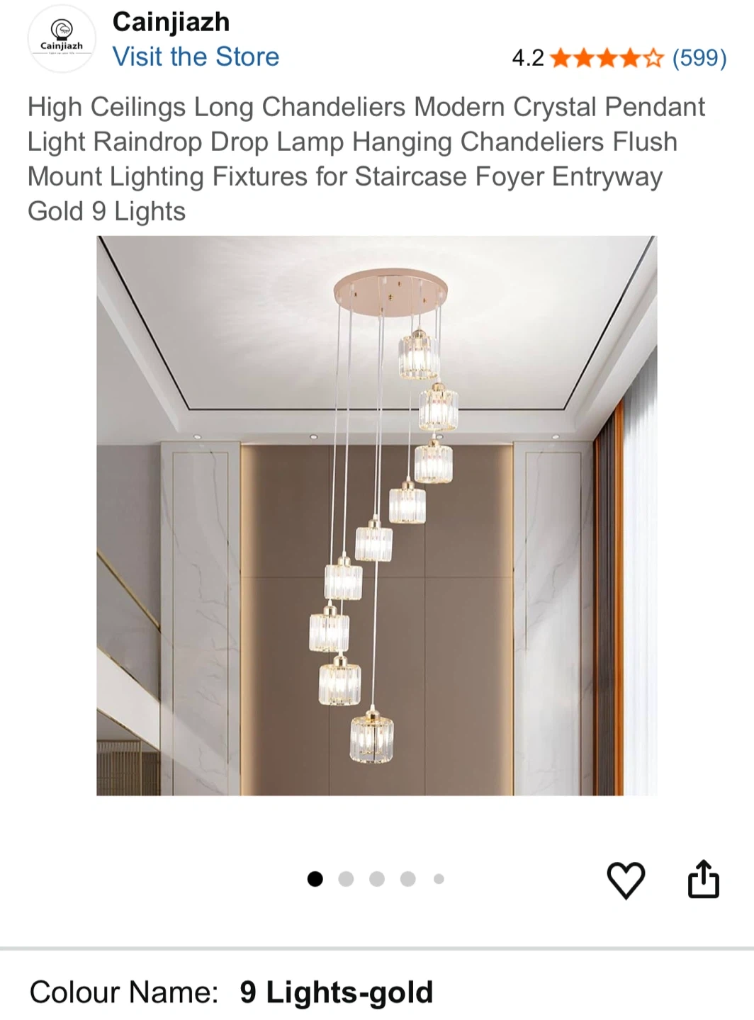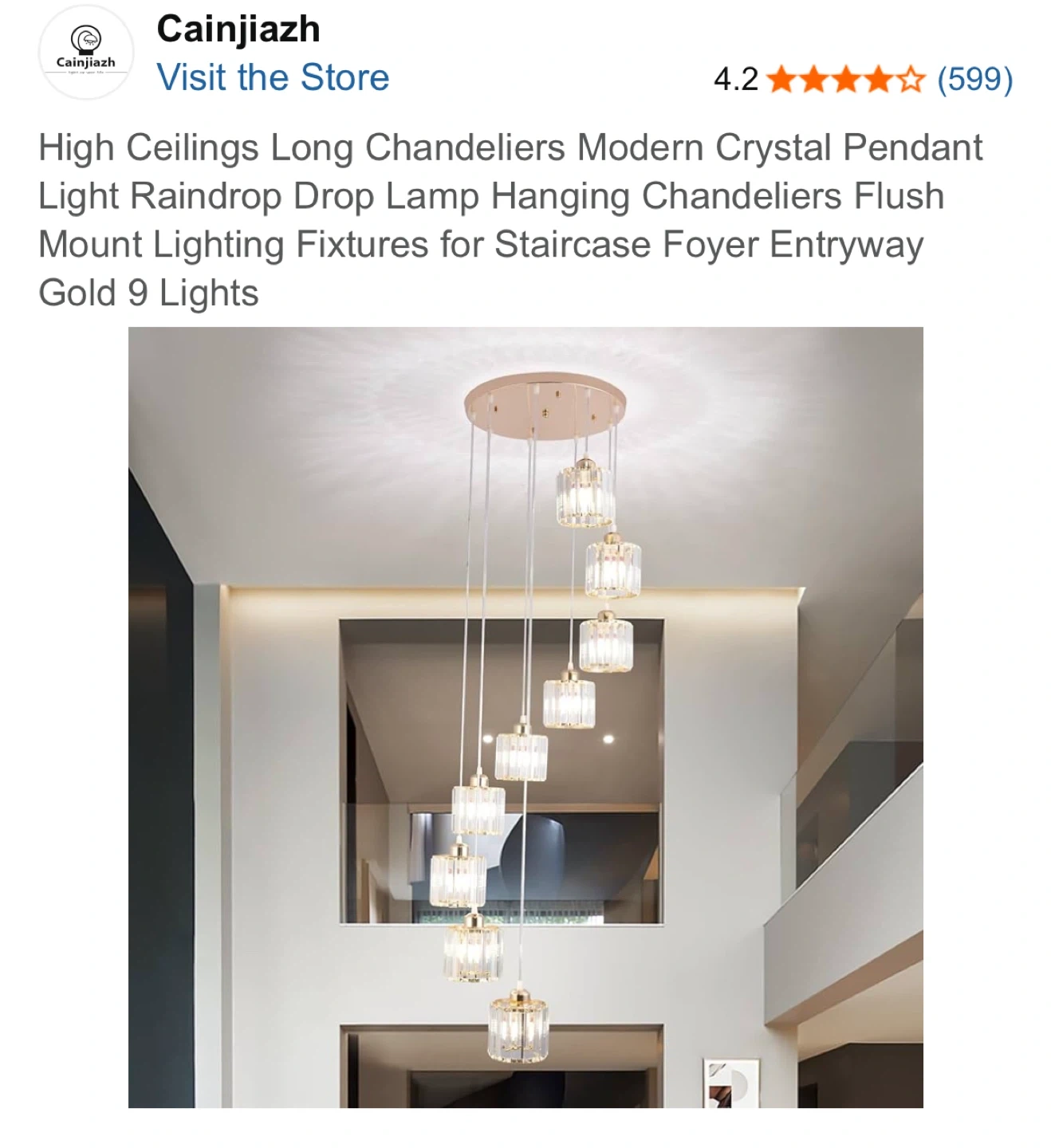This is a modern crystal pendant light fixture with 9 lights in a gold finish. It's designed for high ceilings and features a raindrop design. Crystal material.