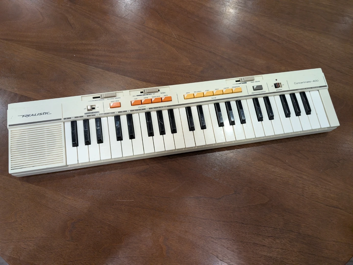 This Realistic Concertmate 400 keyboard is a great starter instrument. It features a 37-key layout. Battery powered operation.