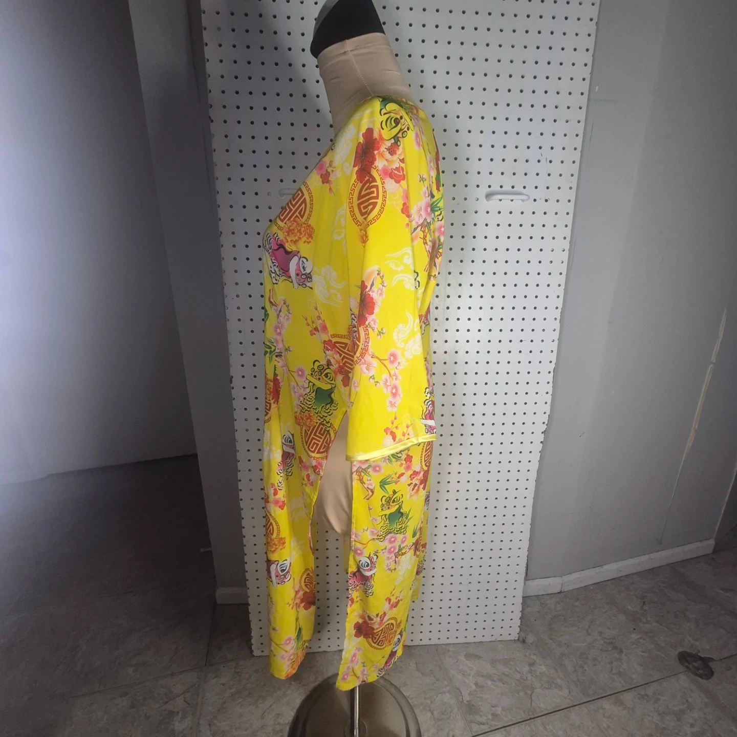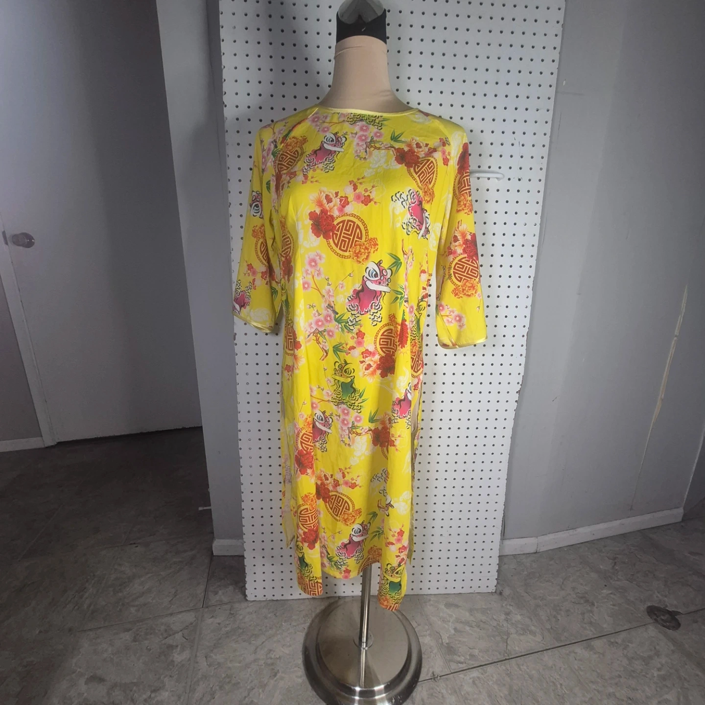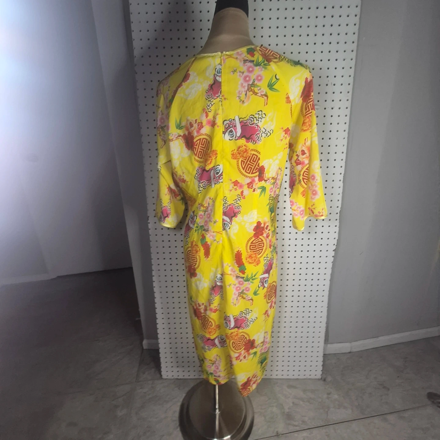 Here's a vibrant yellow dress with a beautiful floral print! It features a unique design and would be a lovely addition to your wardrobe. It's in great condition and ready for a new home!