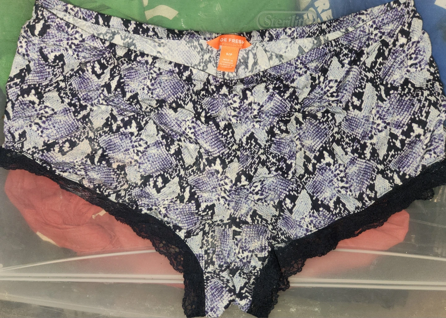 Here's a pair of Joe Fresh underwear in size S/P. It features a snake print design and has black lace trim. It's in great condition! Pickup Only Unless near intersection of Oxford and Gammage Street.