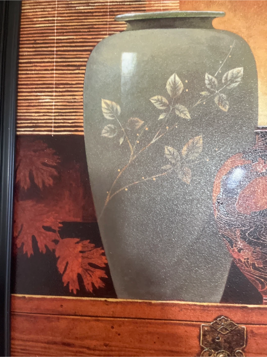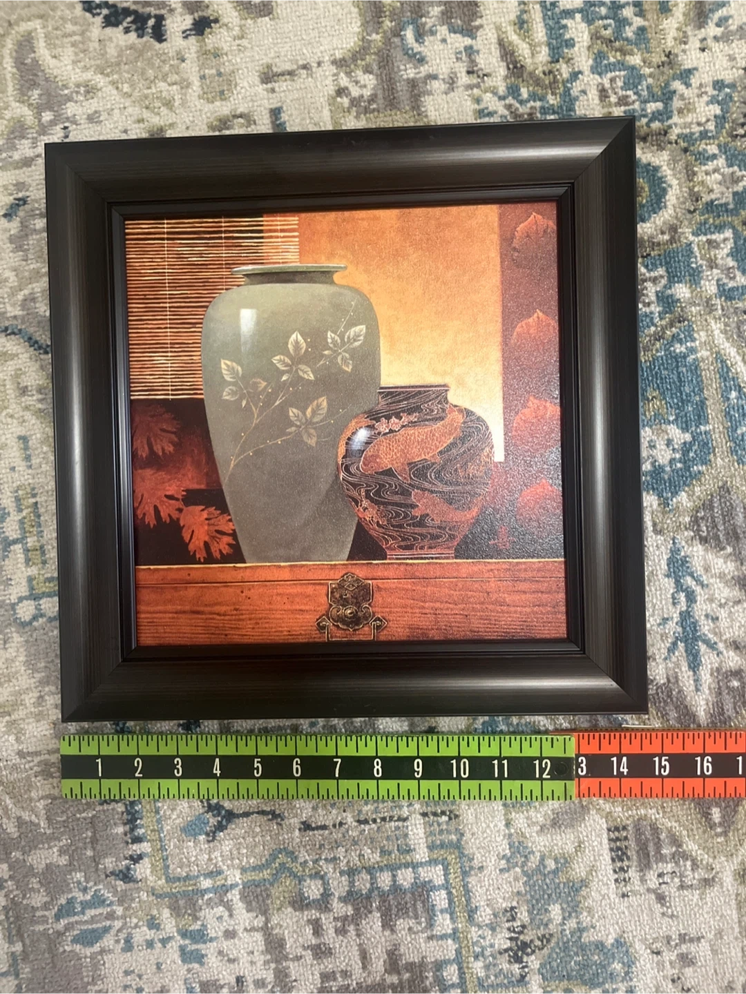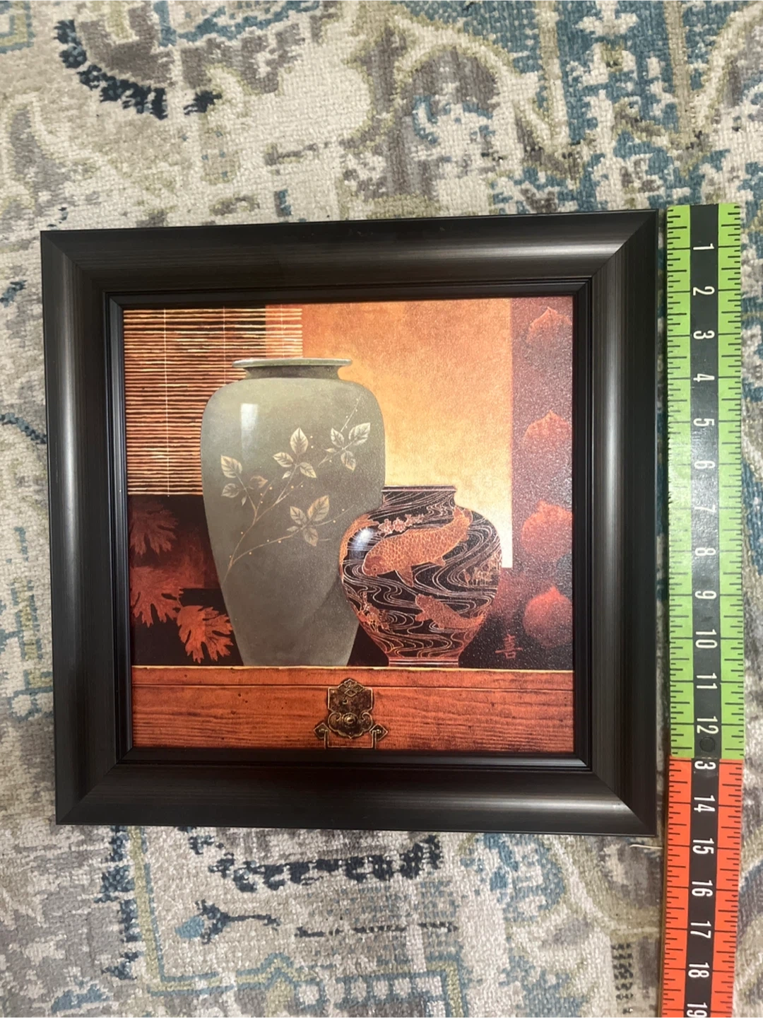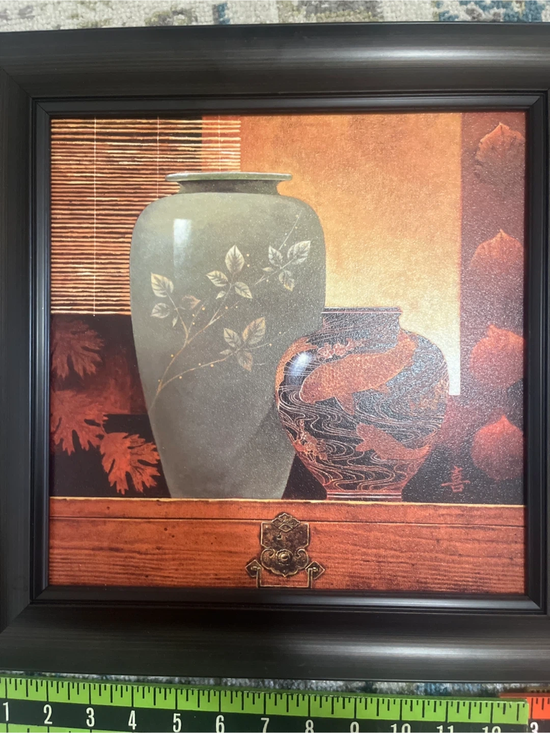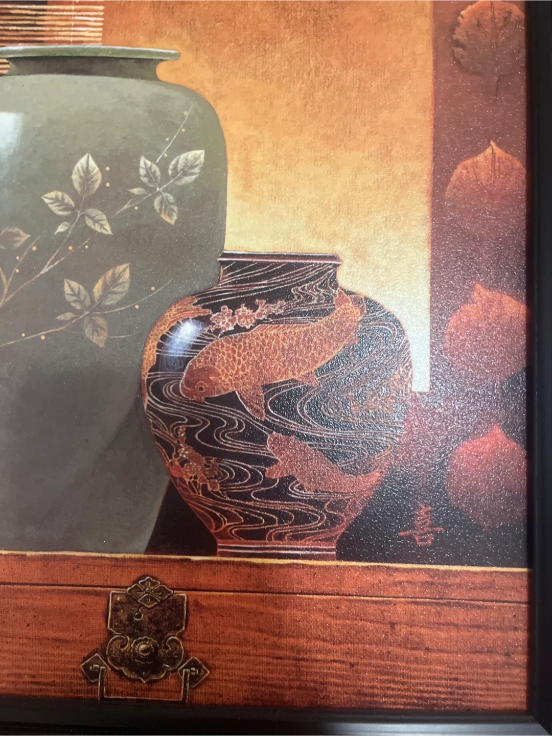 This is a framed print featuring two decorative vases. It has a matte black frame. The print itself depicts a large green vase with delicate leaf accents and a smaller, darker vase with a dragon or koi fish design. The artwork has warm, earthy tones.