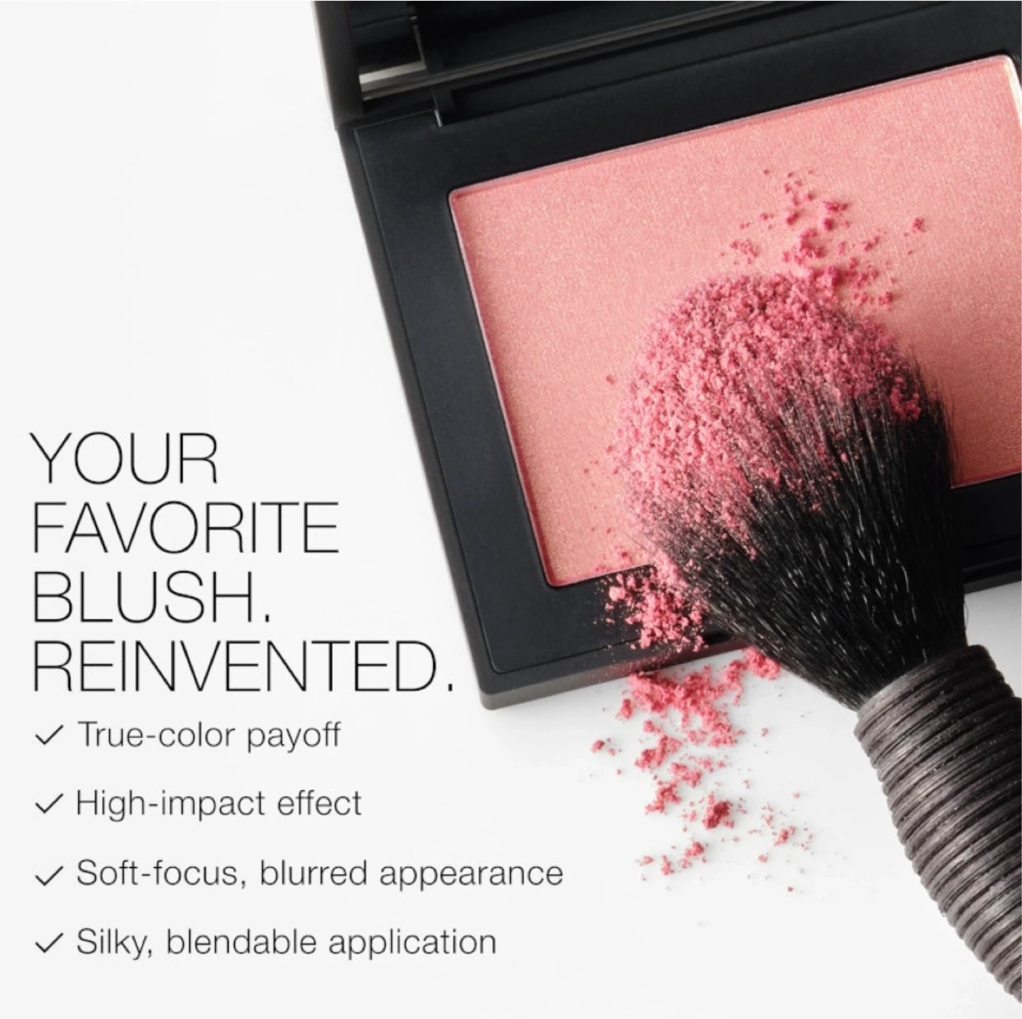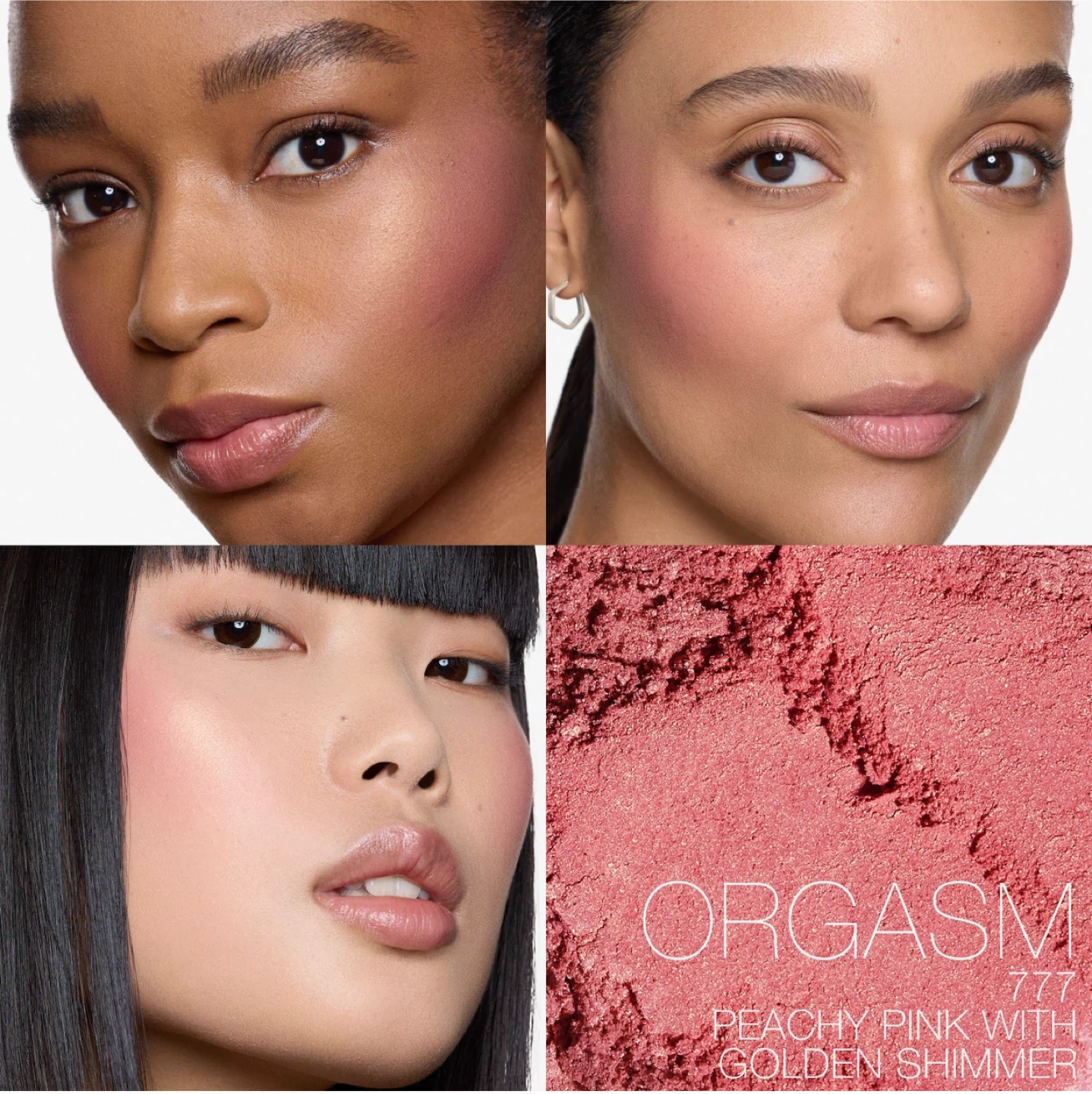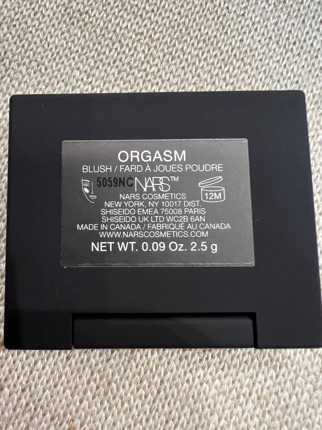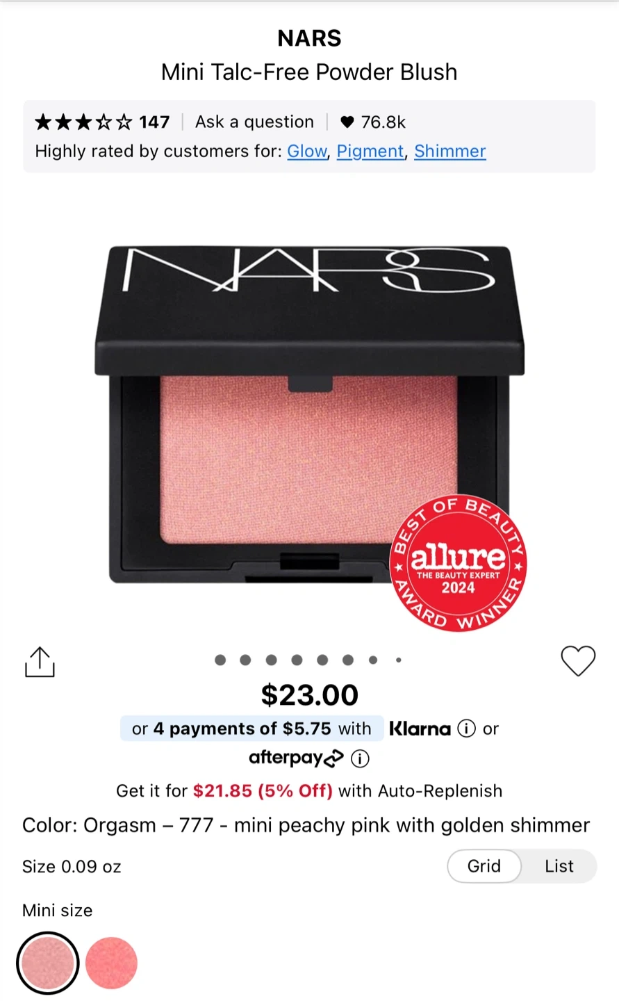 This is the NARS Orgasm blush in a mini size. It's a peachy pink with golden shimmer. The formula is talc-free and offers true-color payoff with a silky application.
