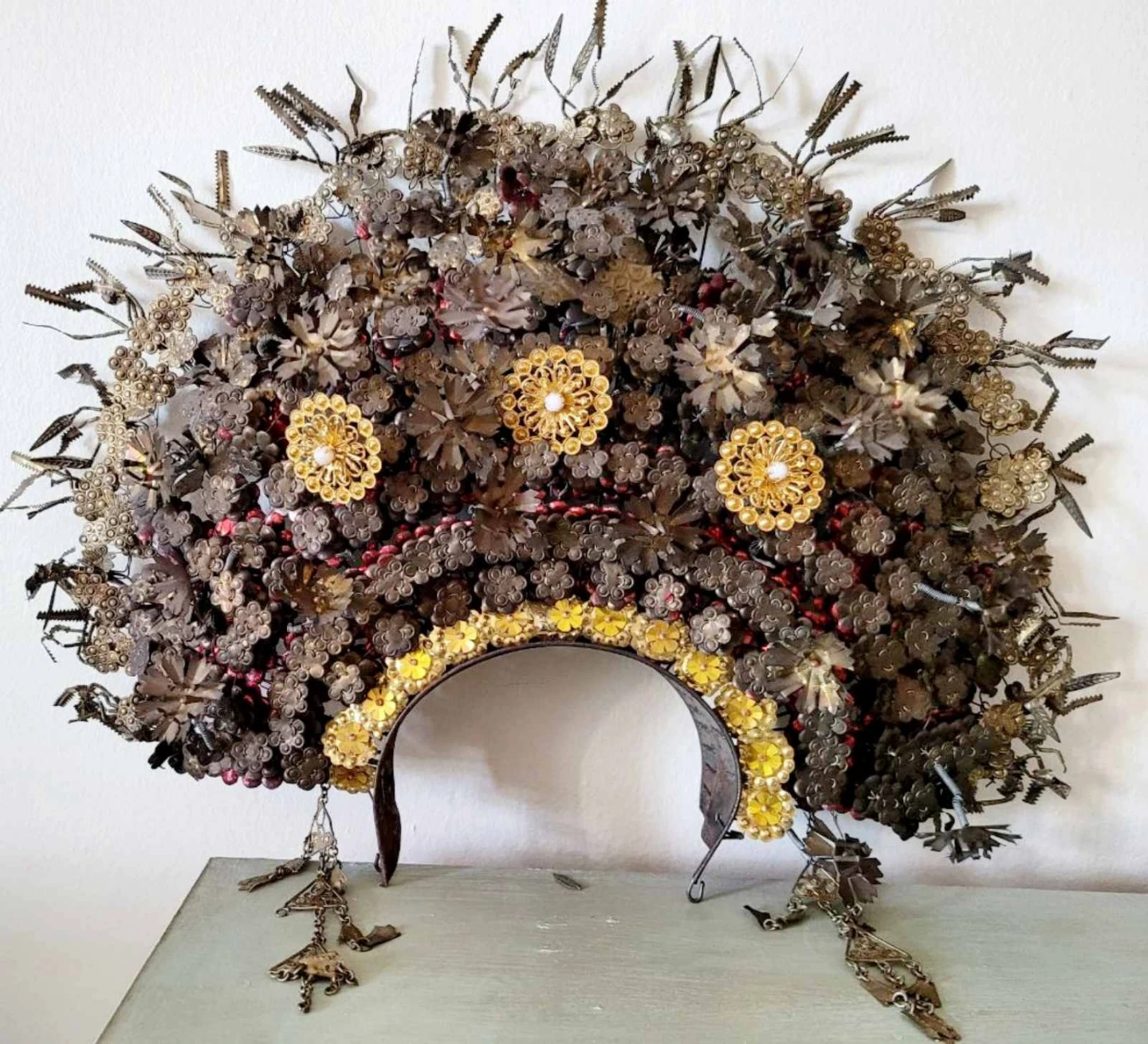 This ornate headdress is crafted from metal with intricate floral and leaf designs. It features gold-tone accents and hanging decorative elements. This piece would make a striking decorative item or costume accessory.