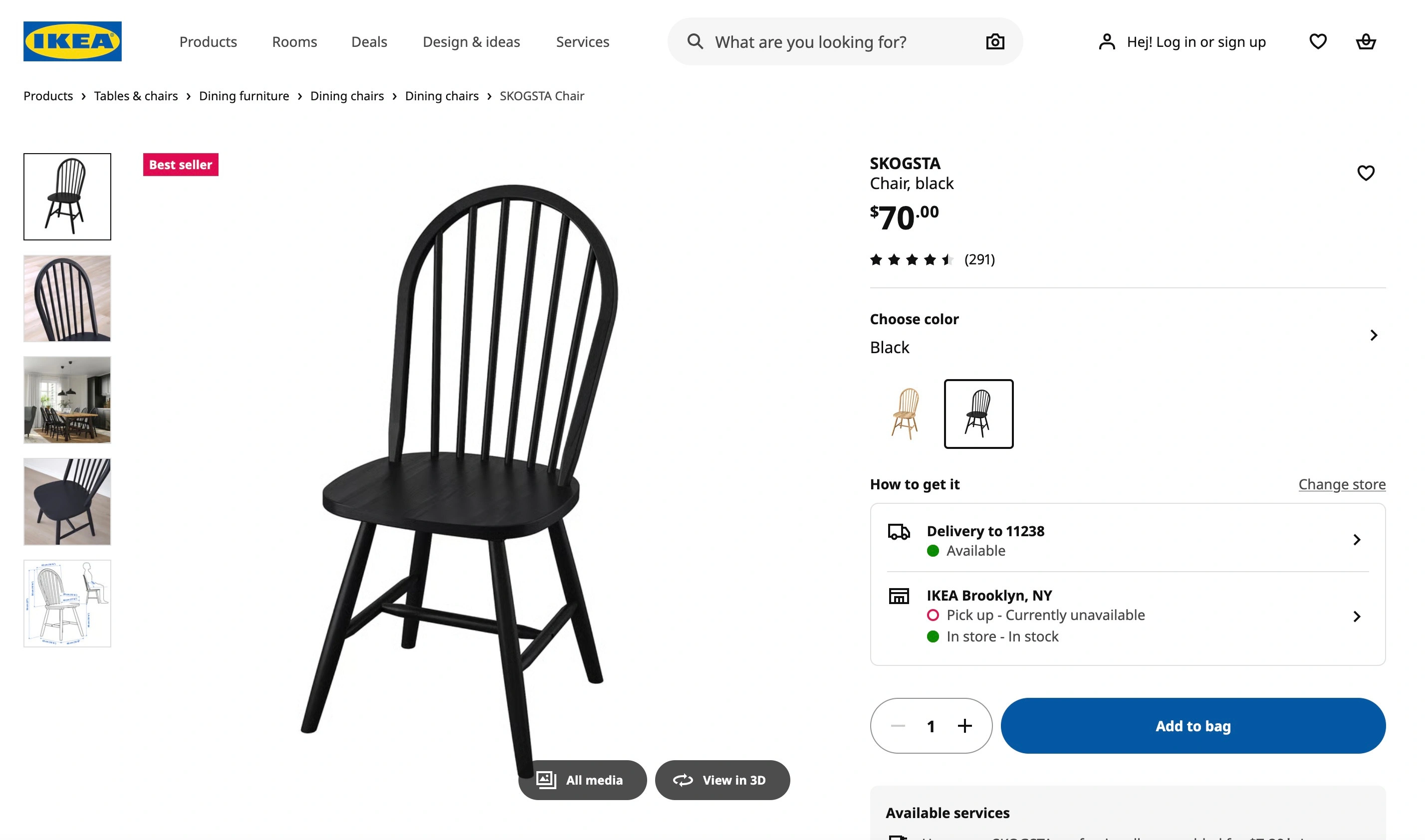 10Selling Ikea Skogsta Chair in black color Black stained solid acacia wood chair with arched backrest and characteristic spindles – a classic look that ages beautifully and will keep its appeal in your home over many years.