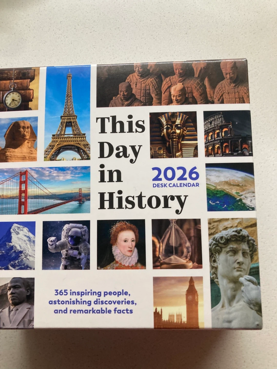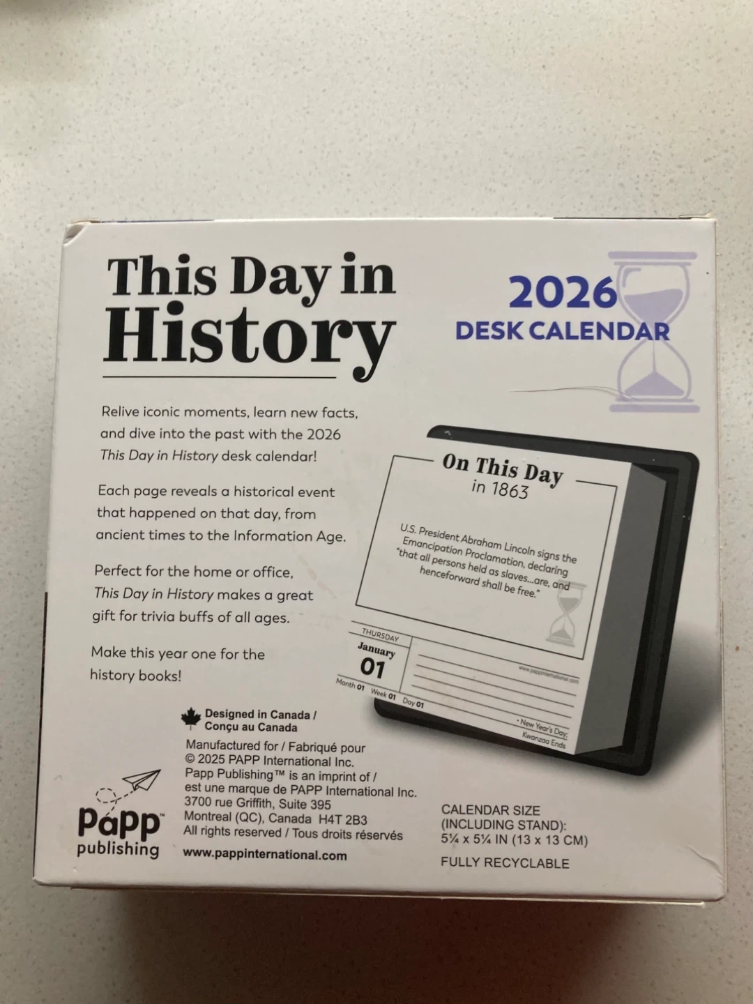 Relive iconic moments, learn new facts, and dive into the past with the 2026 This Day in History desk calendar! Each page reveals a historical event that happened on that day, from ancient times to the Information Age. Perfect for the home or office. This Day in History makes a great gift for trivia buffs of all ages. Calendar size (including stand): 5½ x 5¼ in (13 x 13 cm)