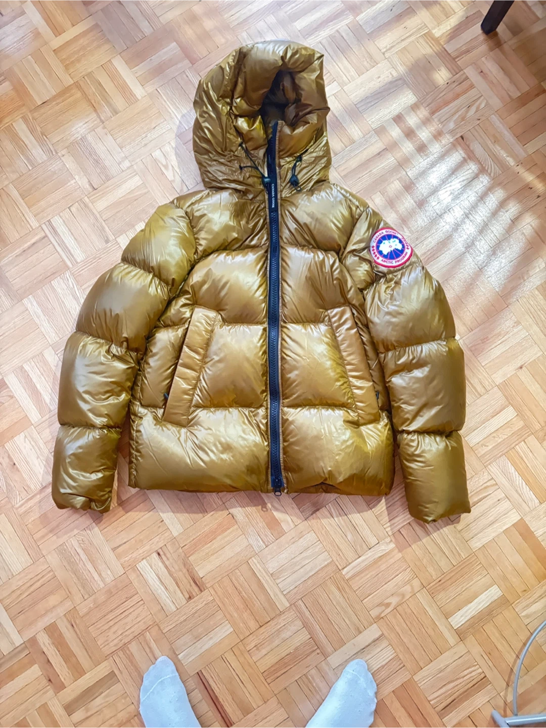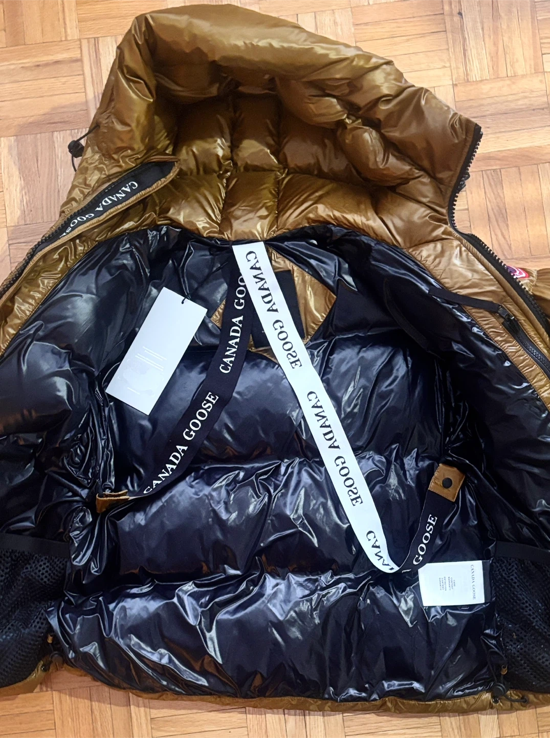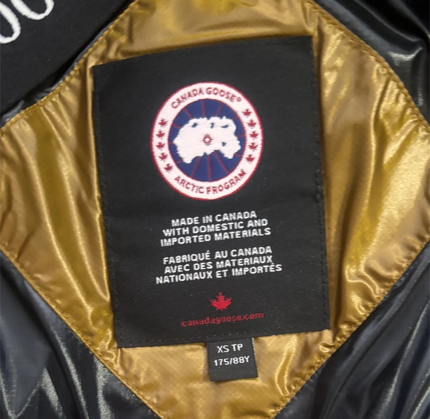 This is a Canada Goose down-filled winter jacket. It's gold and black with a hood. Made in Canada with domestic and imported materials. Size XS.