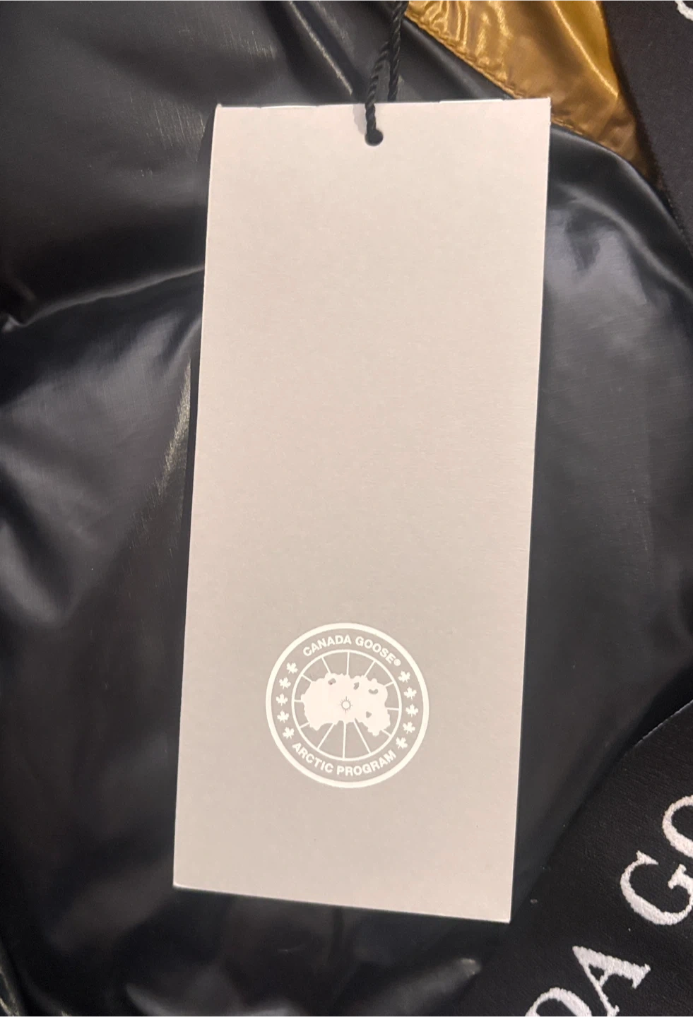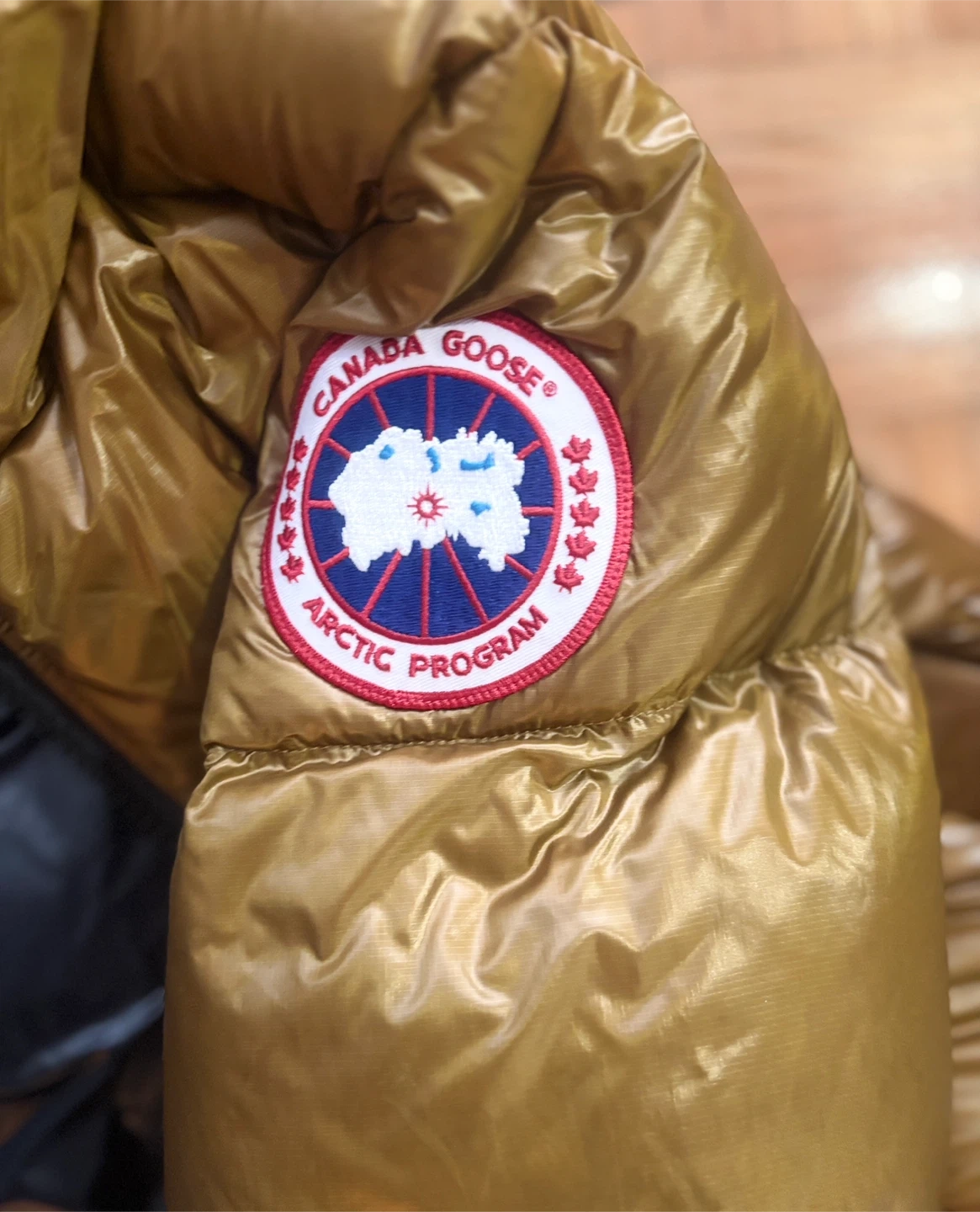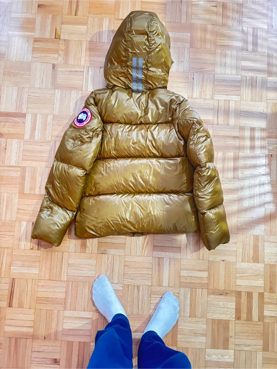 This is a Canada Goose down-filled winter jacket. It's gold and black with a hood. Made in Canada with domestic and imported materials. Size XS.