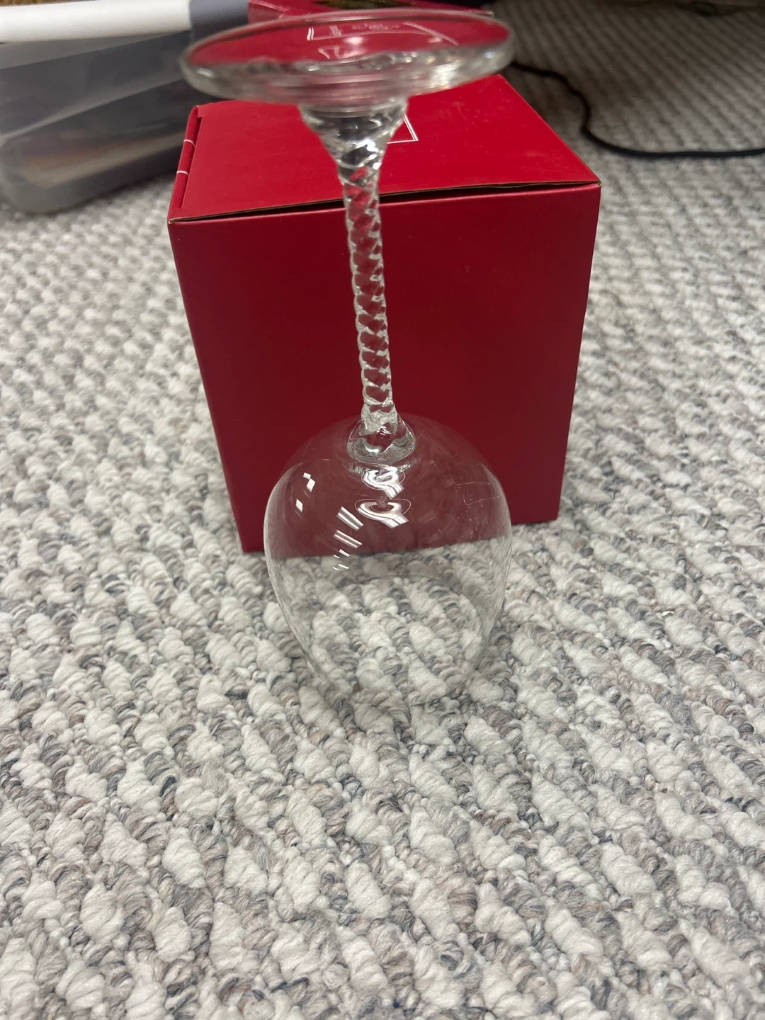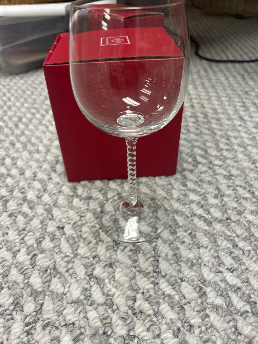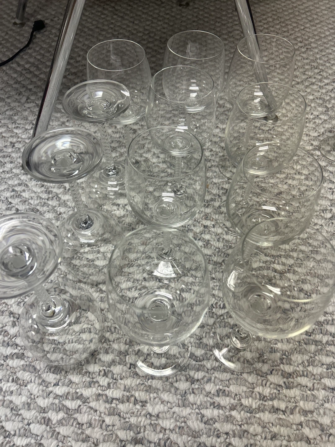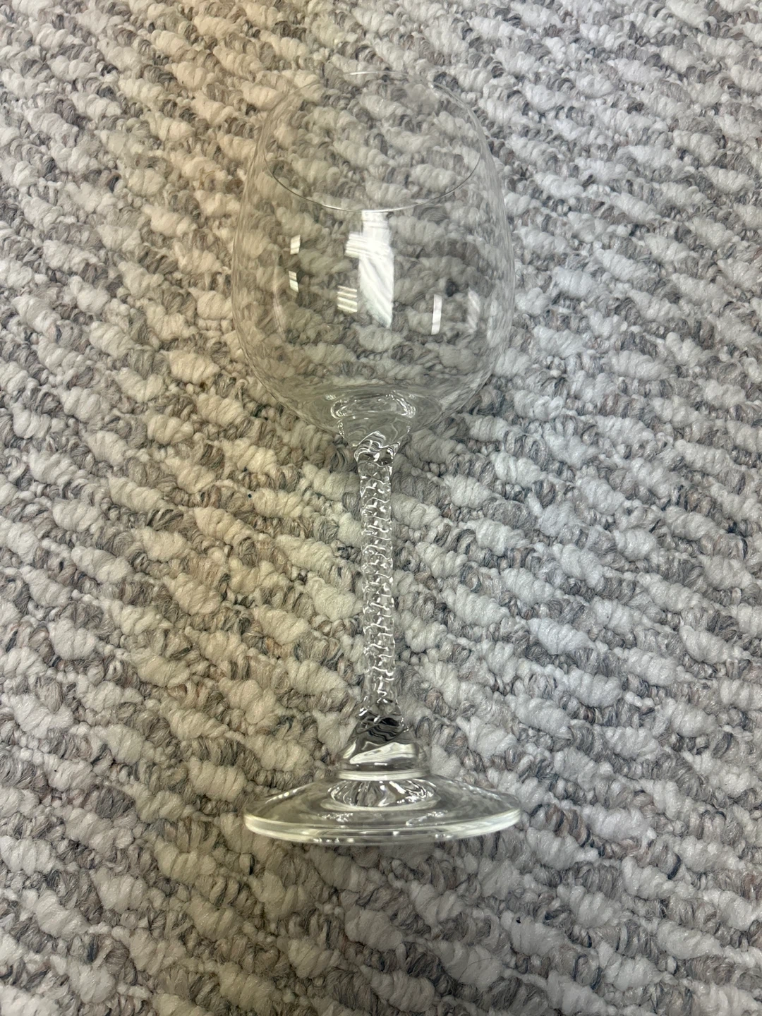 This is a set of 12 clear crystal wine glasses. They feature unique twisted stems for an elegant touch. Perfect for serving wine at gatherings or for everyday use!