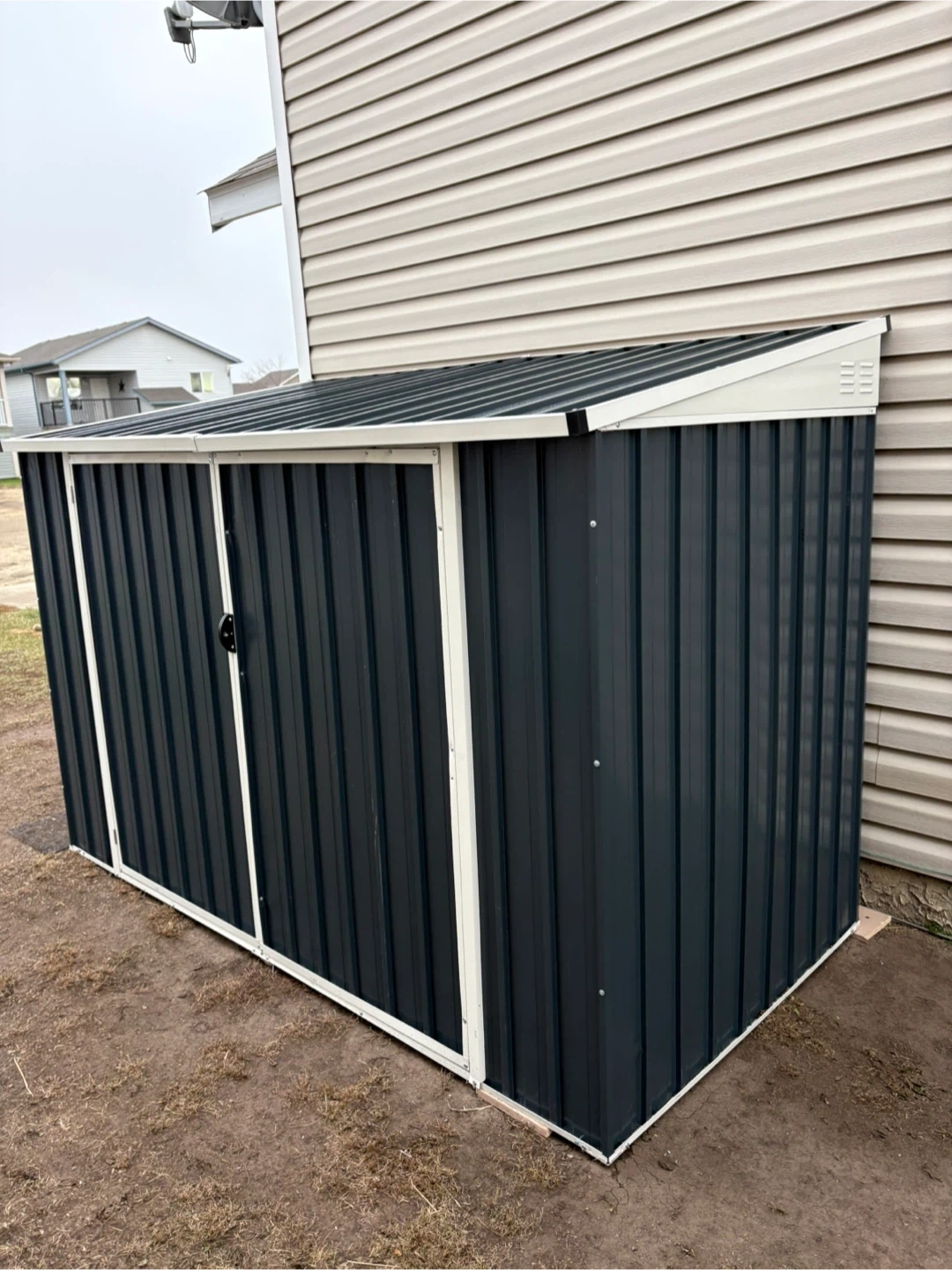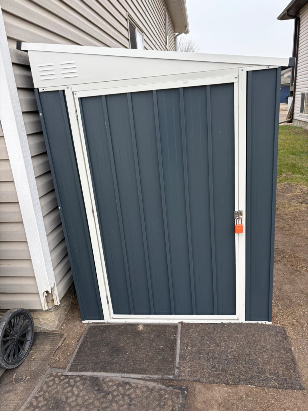 This is a dark grey metal storage shed with a white trim and a slanted roof. It has a single door with a lock. Perfect for storing garden tools or outdoor equipment. The shed is made of durable metal.my need to take in one pc payed over 385 for it sell for 200 moving must sell fcfs just installed this fall .sealed side doors shut only front door can store my tires and things easy .just installed in oct .