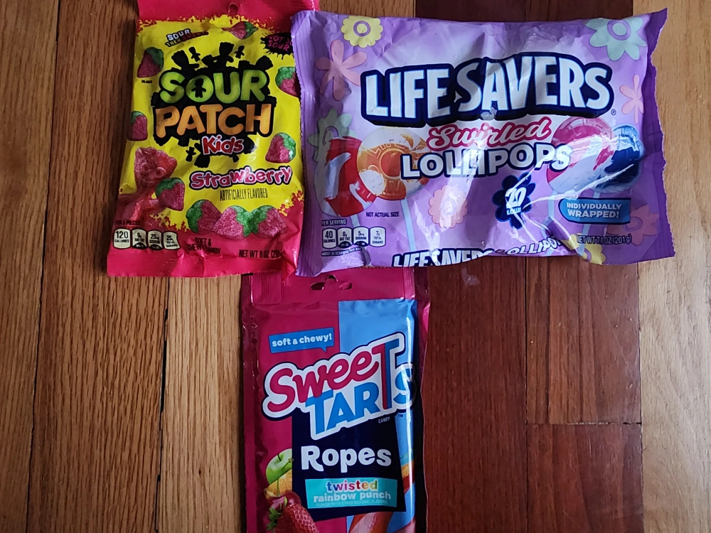 Giving away variety of candies! You'll get a bag of Sour Patch Kids Strawberry, a bag of Life Savers Swirled Lollipops, and a bag of Sweet Tarts Ropes in twisted rainbow punch flavor