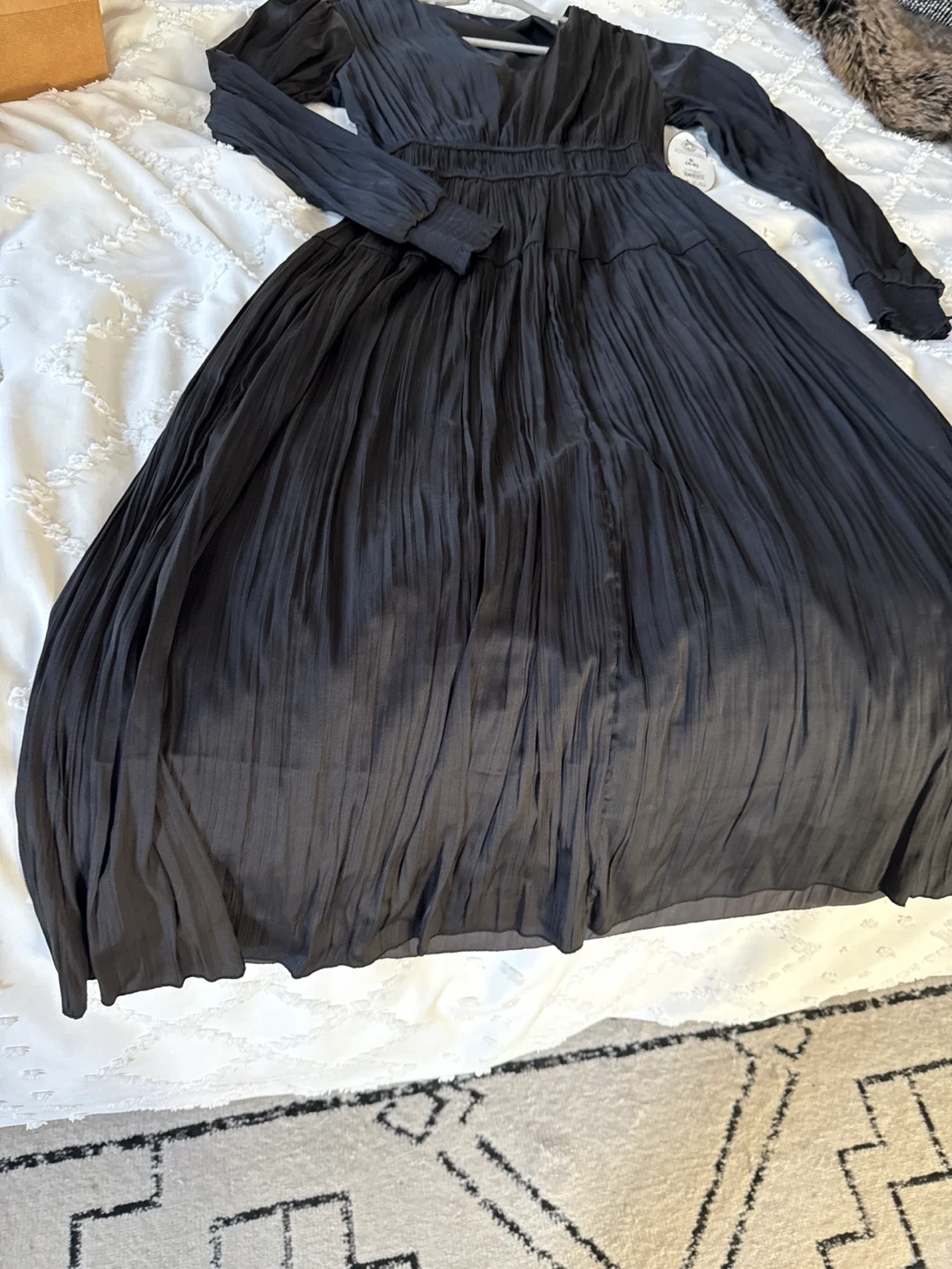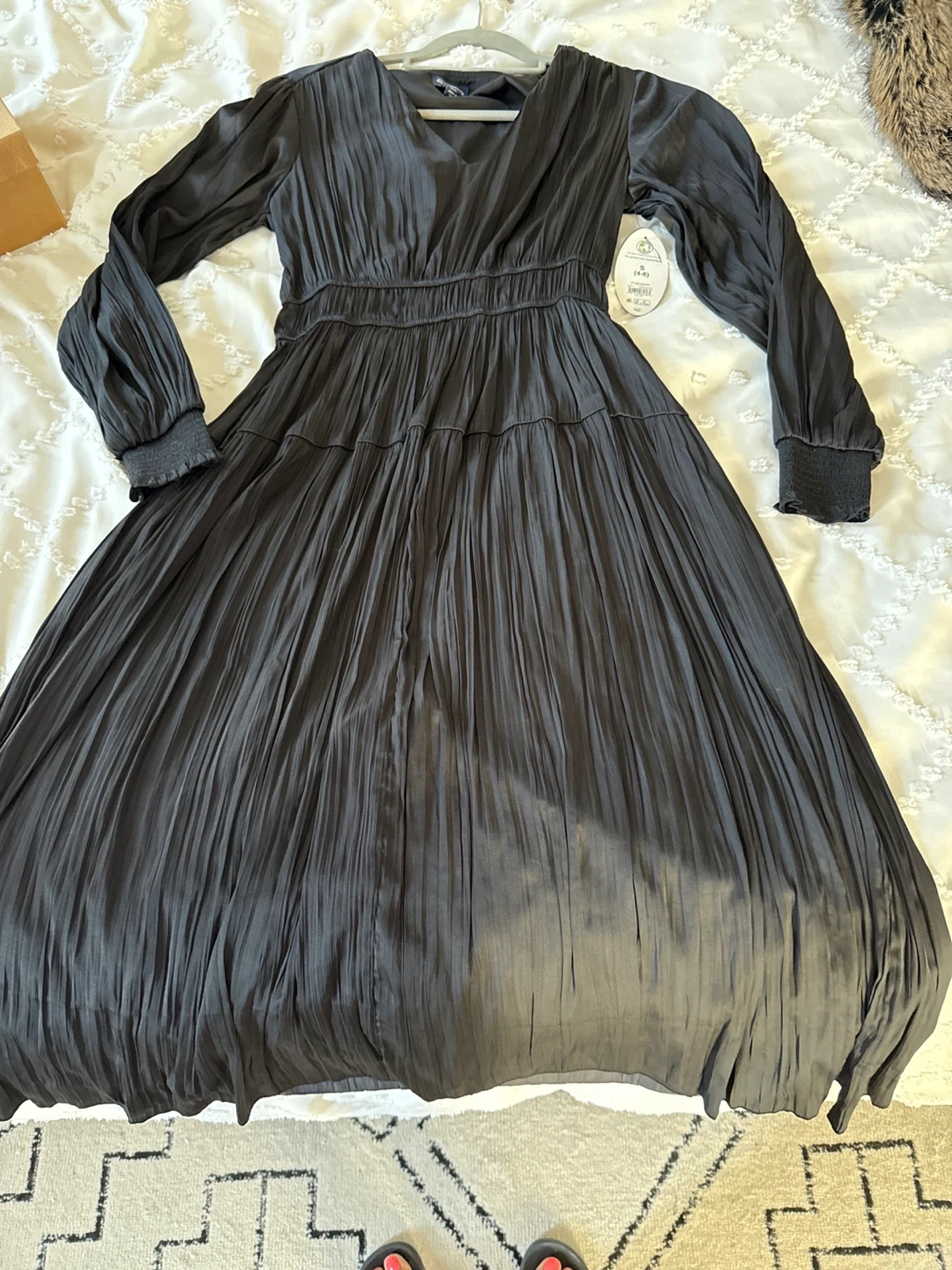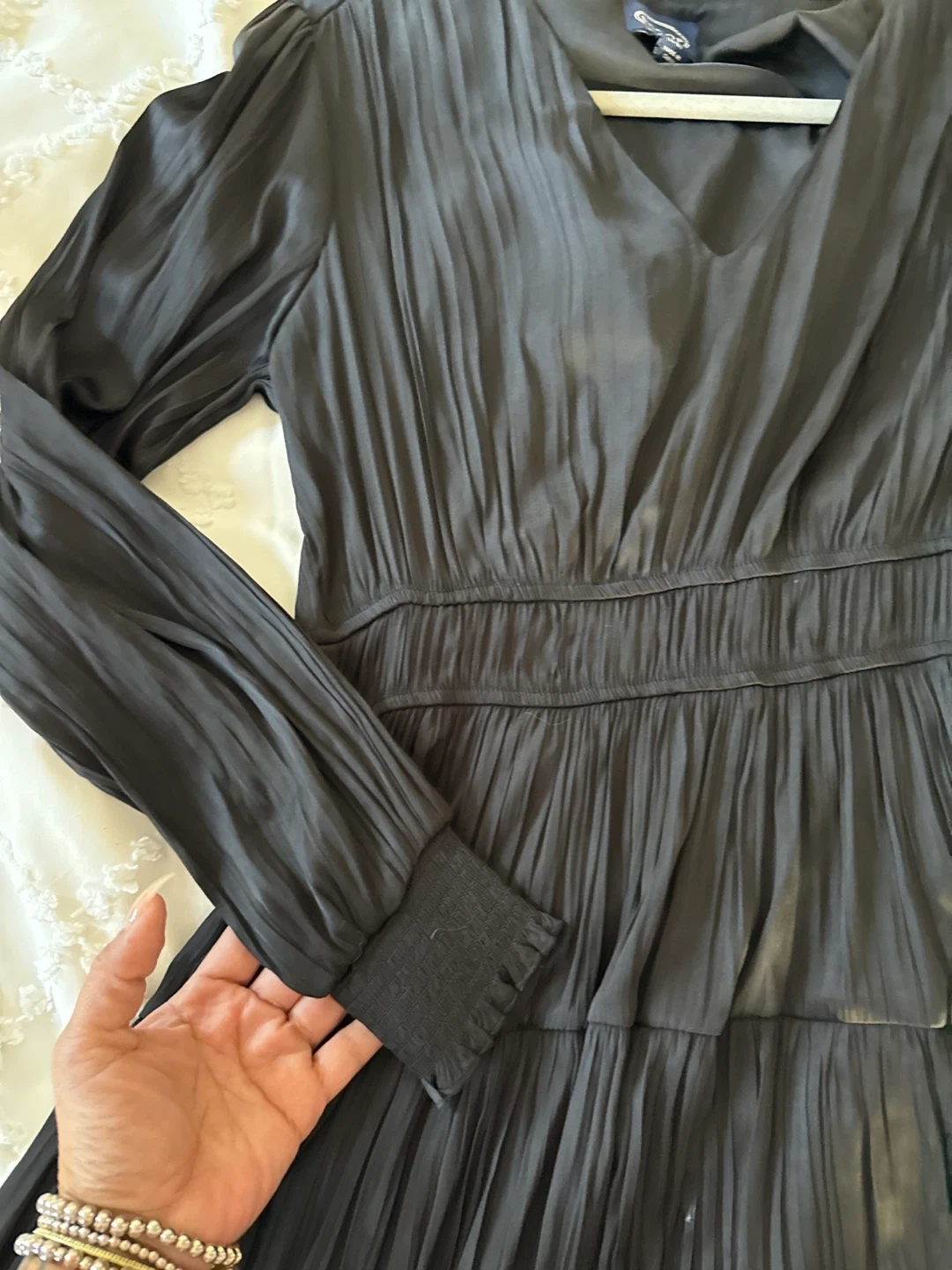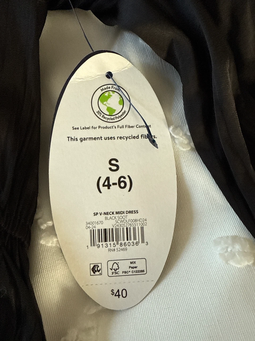 Selling a stylish SP V-neck midi dress in black. It's a size S (4-6) and made with 30% recycled polyester. This garment uses recycled fibers. Originally bought for $40