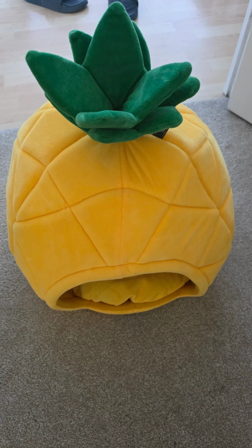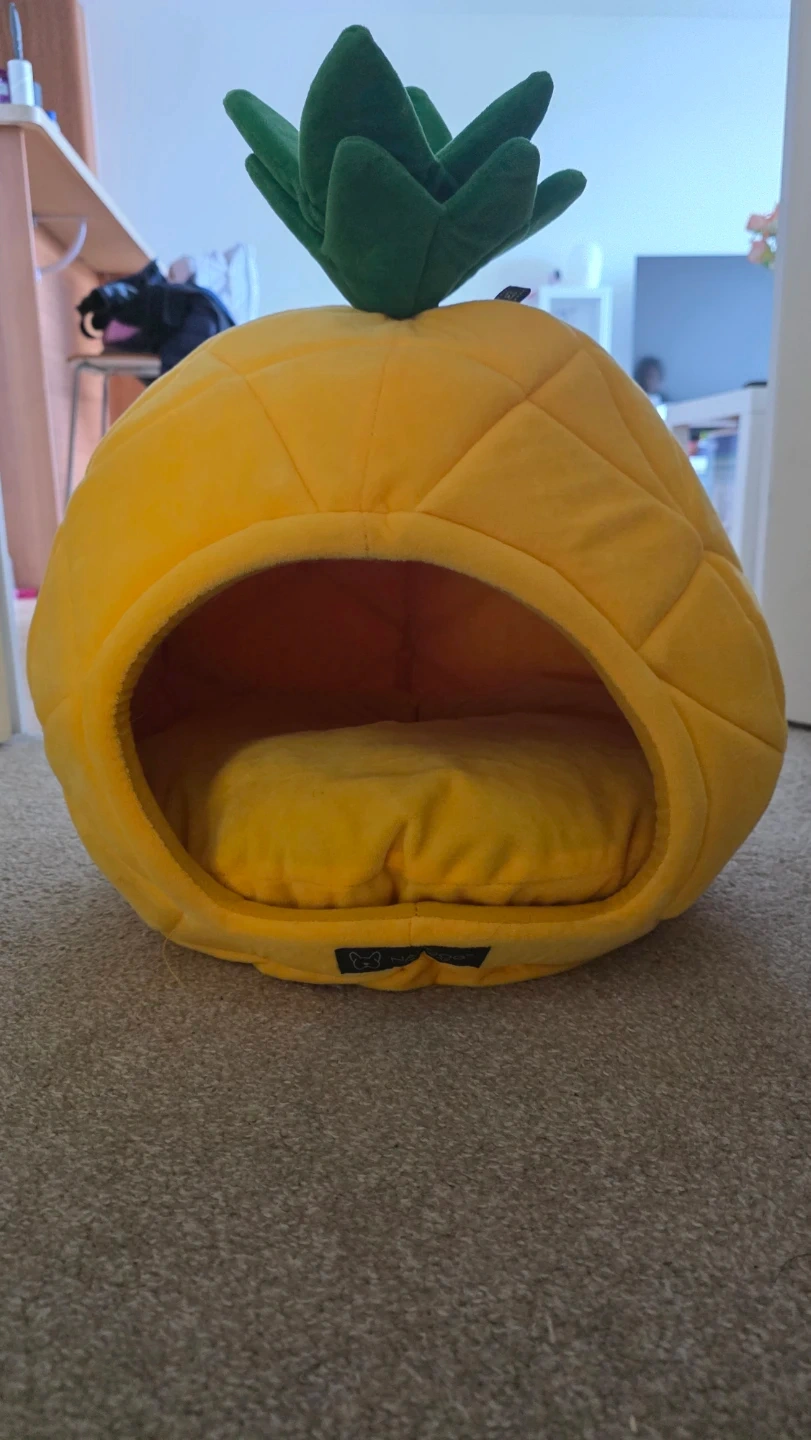 This plush pineapple pet bed is made of 100% polyester fiber. It's soft and comfy for your furry friend. Perfect for small to medium-sized pets.