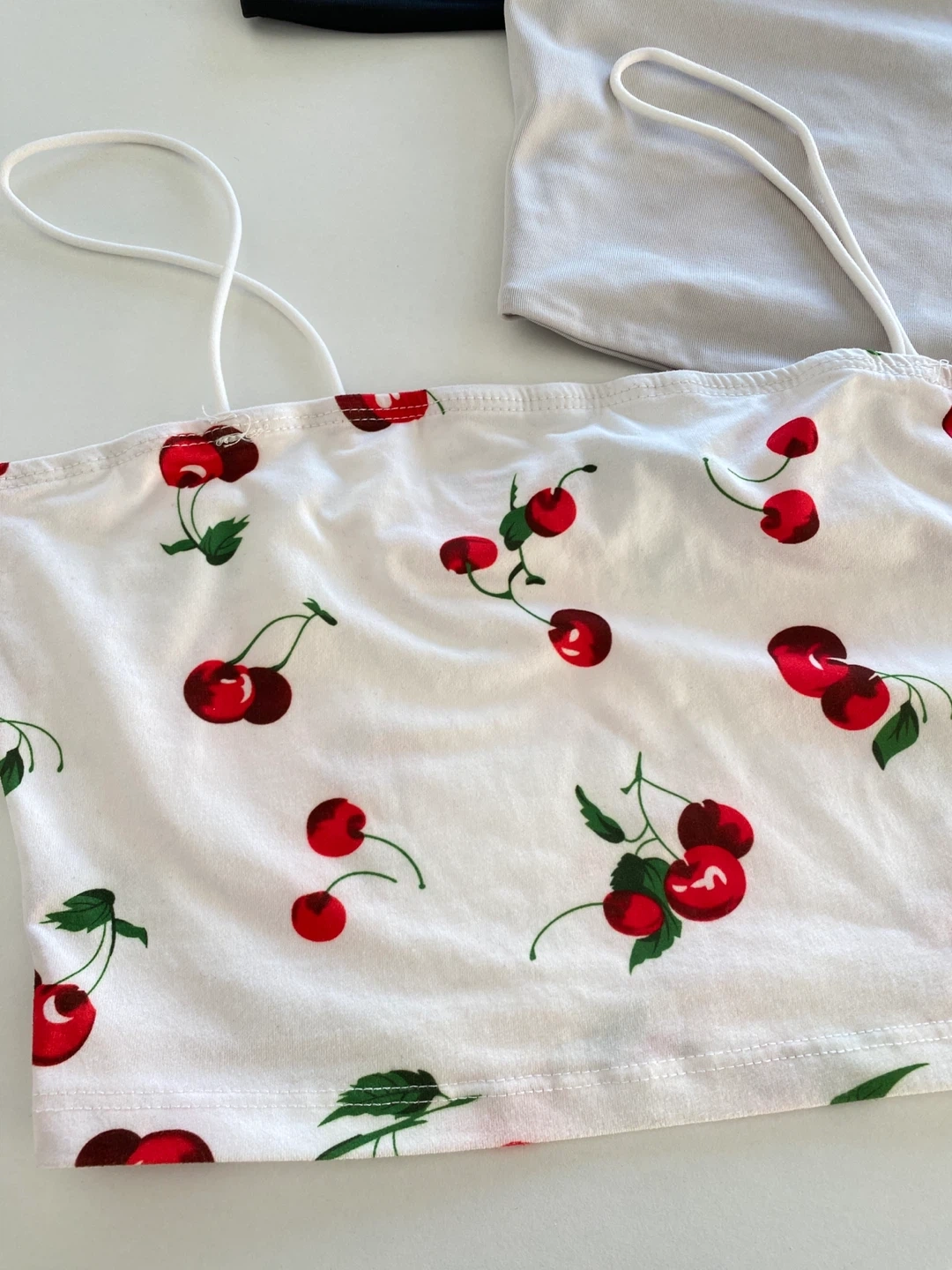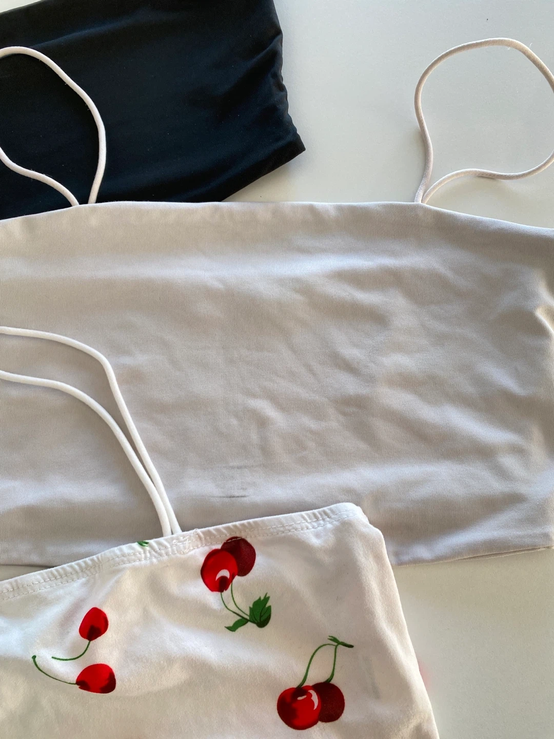 Selling a set of 3 cute tops! There's one in black, one in white, and another with a cherry print. They're in great condition and ready for a new home. You can pair them with anything, wear on their own or create different styles with layering!