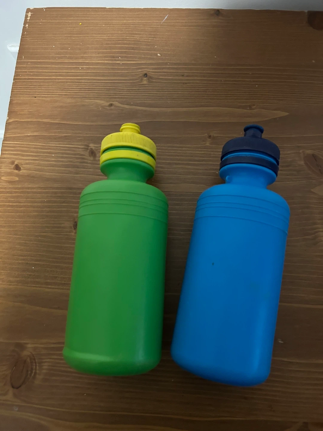 Selling a green water bottle with a yellow cap and a blue water bottle with a black cap. They're made of plastic. These bottles are great for staying hydrated on the go!