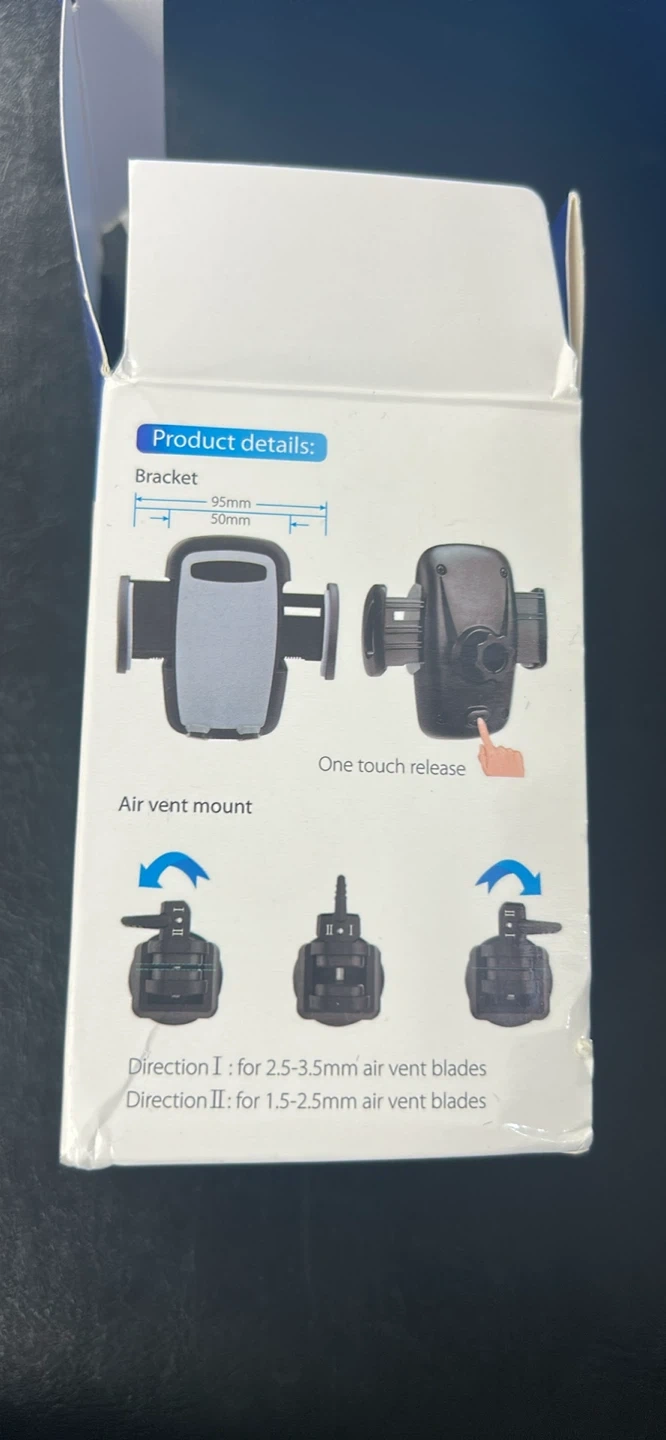 This is a car air vent phone holder. It features a one-touch release mechanism. The air vent mount fits vent blades between 1.5-3.5mm or 2.5-3.5mm.