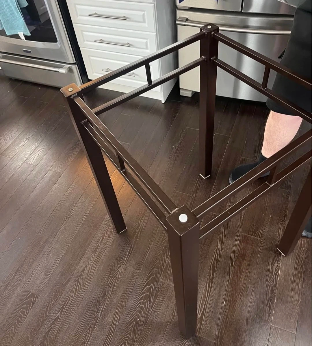 This Tall table features a clear glass top and a sturdy dark metal base. It's a modern and practical addition to any kitchen or dining area. The glass surface is easy to clean and maintain. It's a great size for smaller spaces!