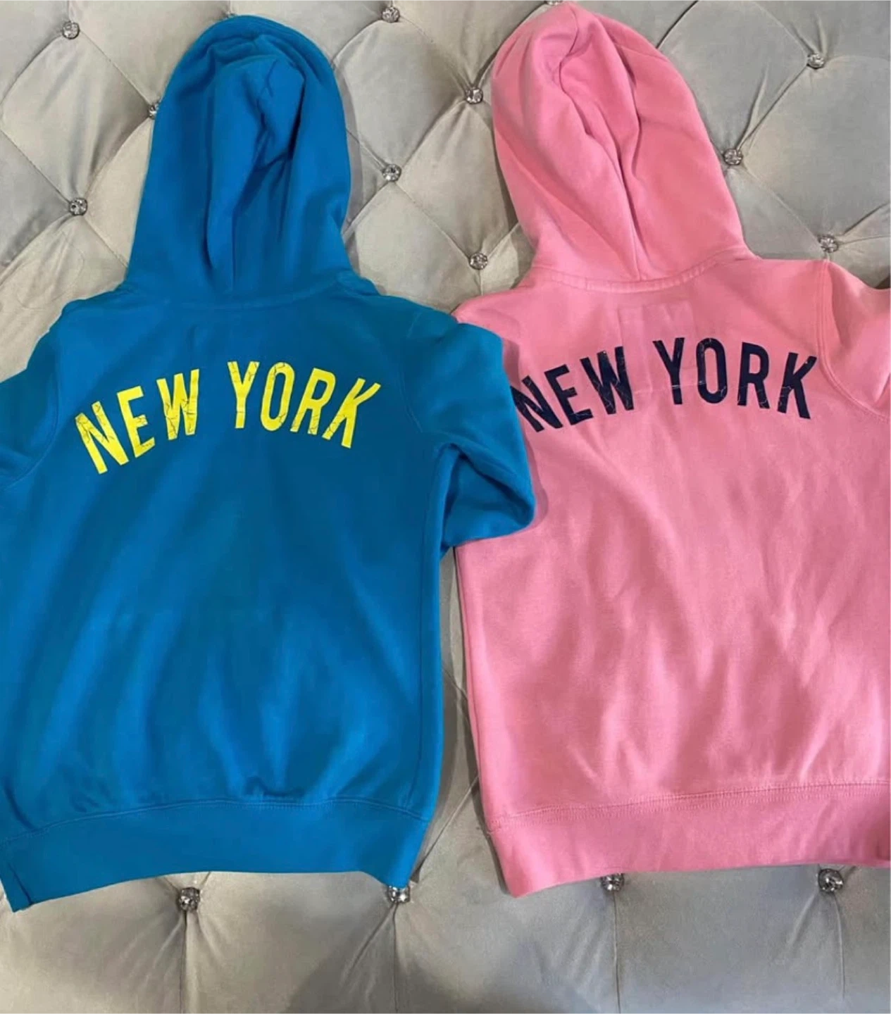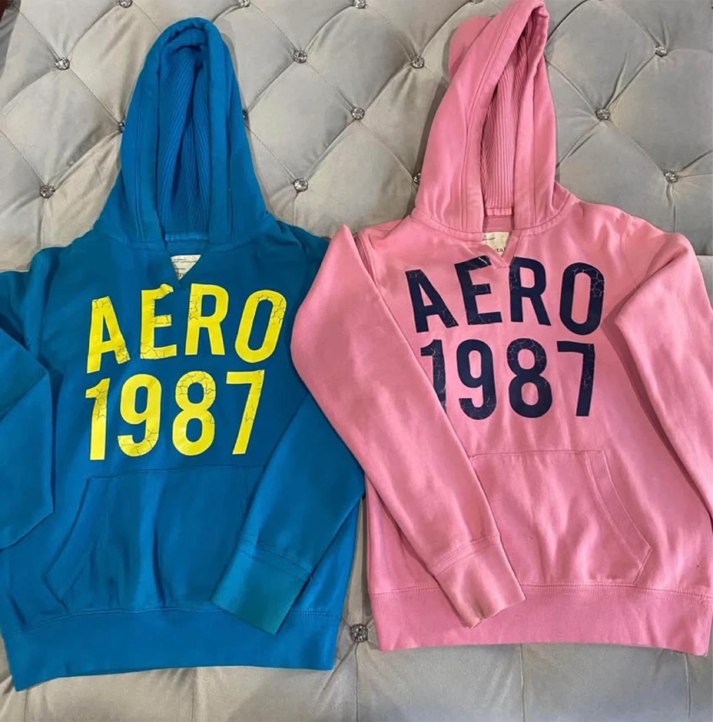 Two Aeropostale AERO 1987 hoodies included, one blue- size XS and one pink- size S. Both feature 'New York' graphic on the back. Cotton blend material. $10 each