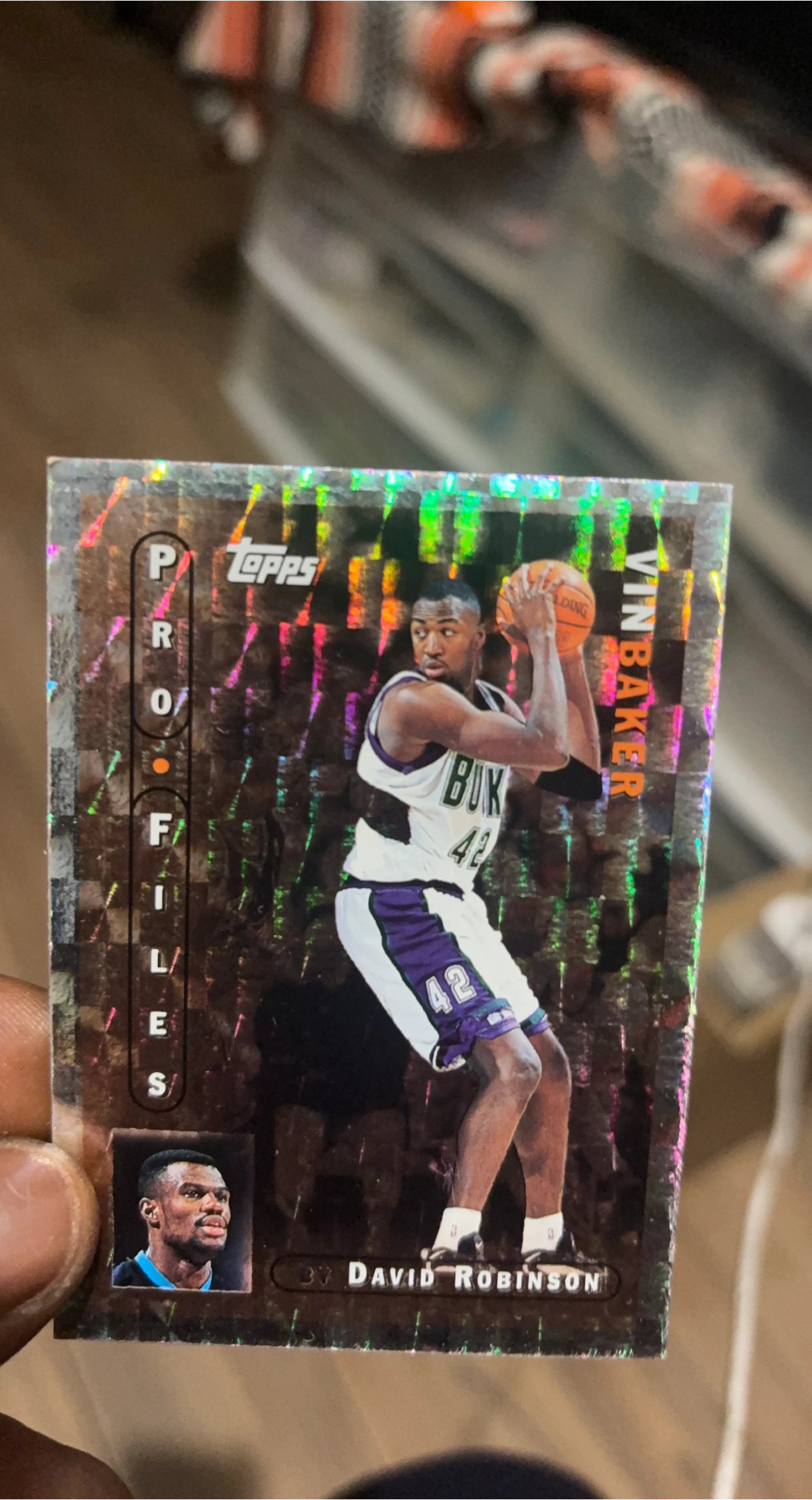 Topps Profiles basketball card featuring Vin Baker. Includes a smaller inset photo of David Robinson. Card has a holographic finish.