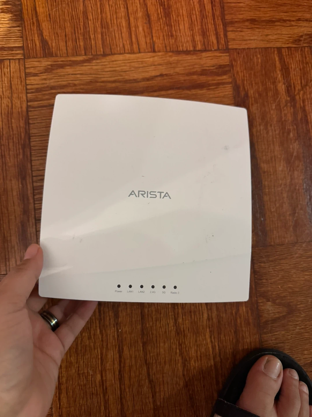 This is an Arista OEM-AP C110 wireless access point. It's white and has indicators for Power, LAN1, LAN2, 2.4G, 5G, and Radio 3. The model number is OEM-AP.C110.