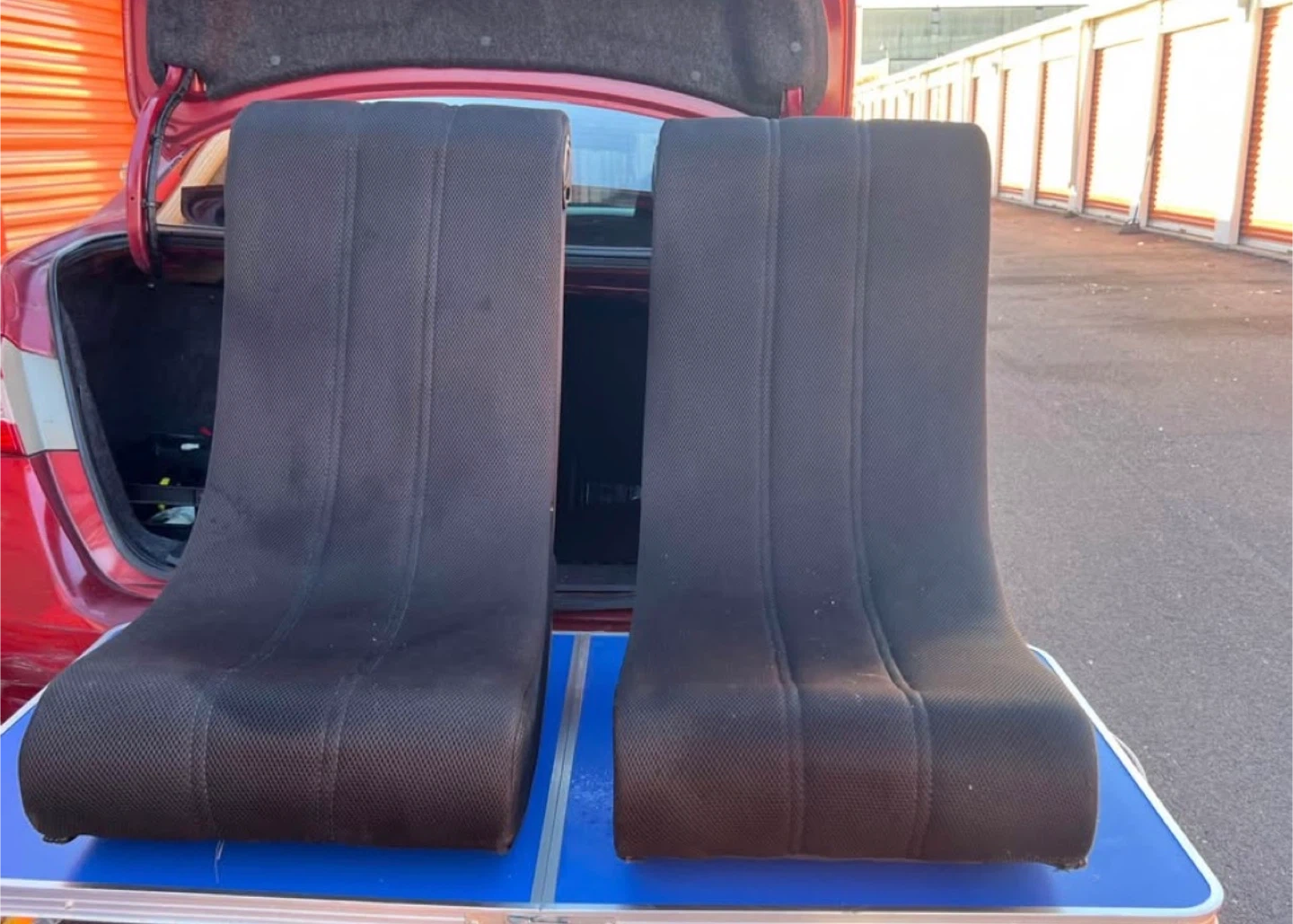 Selling a pair of black bucket seats. Upholstered in a textured fabric. They're great for custom car builds or projects. Fabric material.