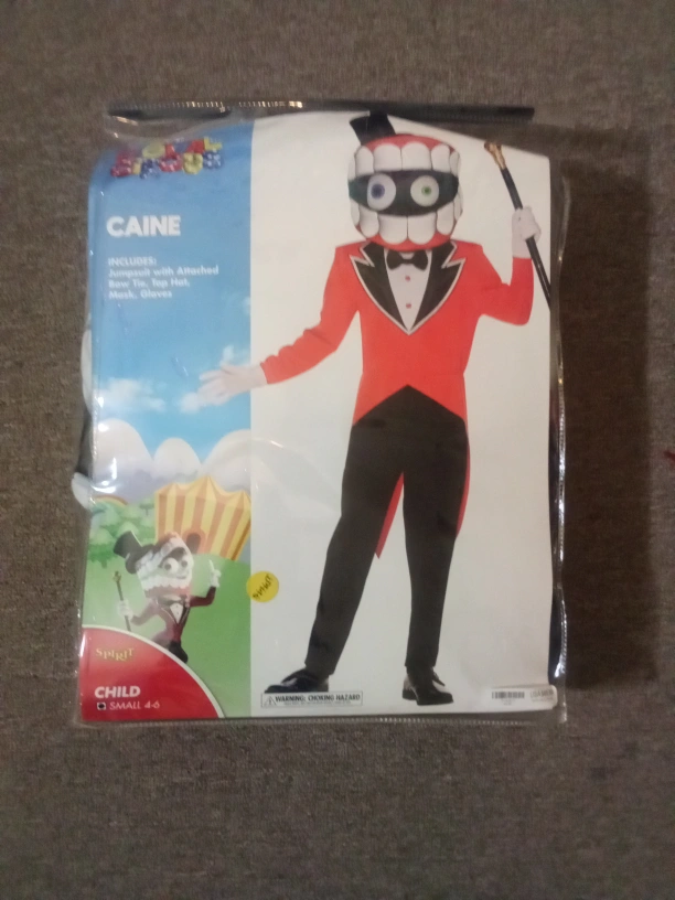 Selling a Spirit Halloween Caine costume for a child. It's a size small, fitting sizes 4-6. Includes the jumpsuit with attached bow tie, top hat, mask, and gloves! Perfect for Halloween or dress-up