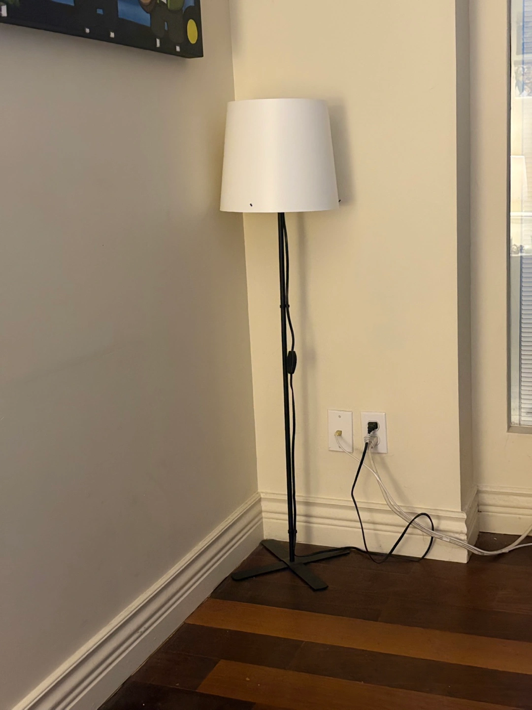 Selling a floor lamp with a white shade and a black stand. It's in great condition and would look great in any room! Easy to assemble and provides a nice ambient light