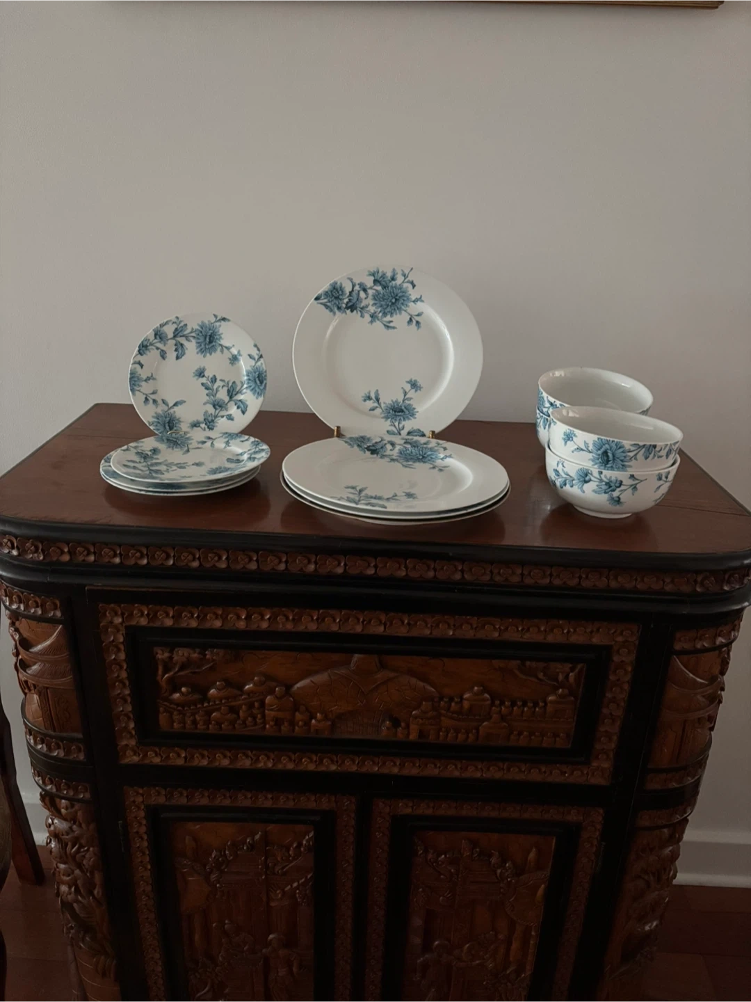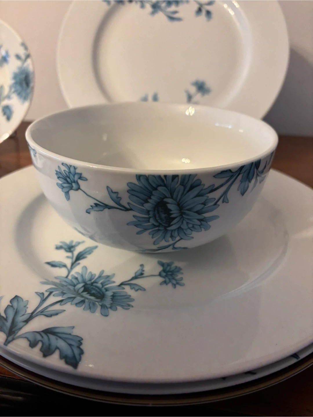 437Selling a set of Spode Home Vintage Blue dinnerware set. These are in great condition and feature a beautiful blue floral pattern. It features 4 dinner plates, 4 salad / dessert plates and 4 bowls . Perfect for adding a touch of vintage charm to your dining table!