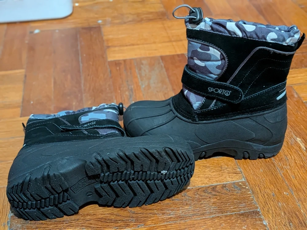 86Selling a pair of Sporto snow boots in size 4 ! They're black with a camo pattern on the upper part of the boot. Perfect for keeping your feet warm and dry this winter