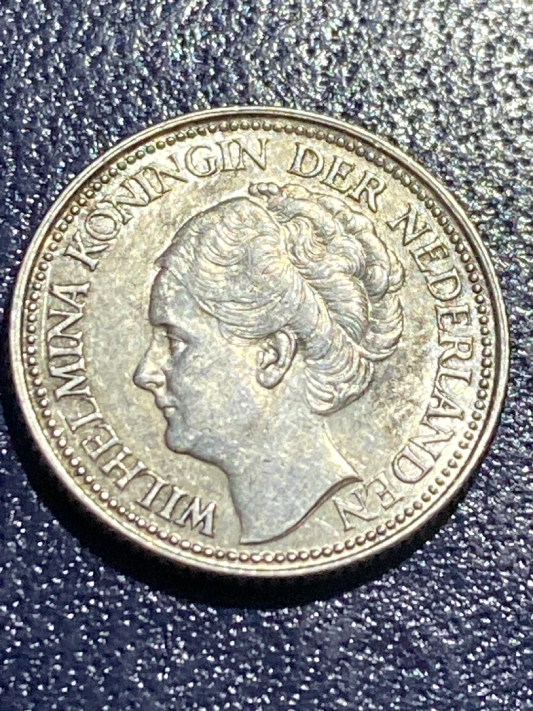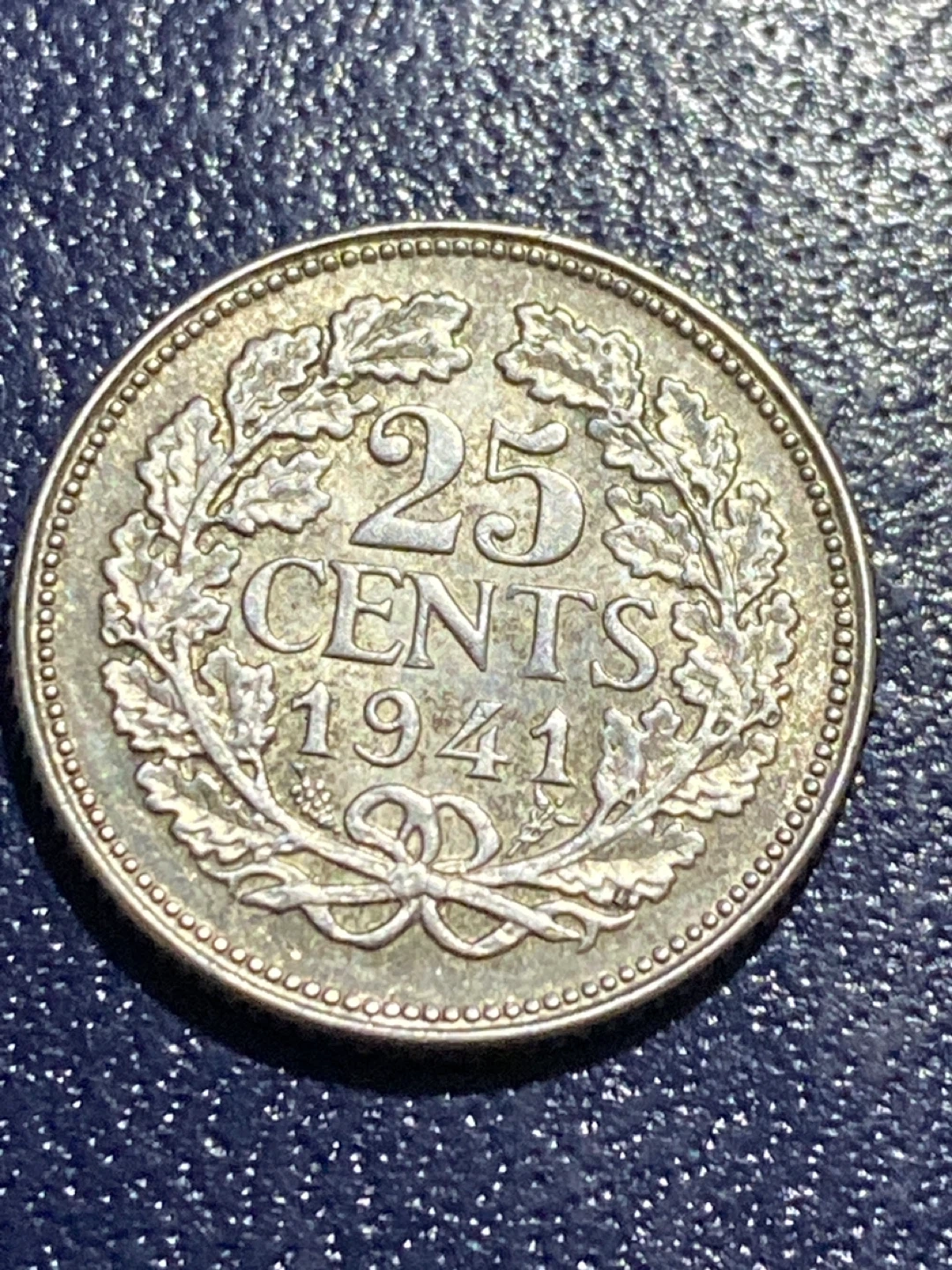 Here's a 1941 silver 25 cent coin from the Netherlands, featuring Queen Wilhelmina. It's a neat piece of history for collectors or anyone interested in numismatics. A great item to add to a coin collection!