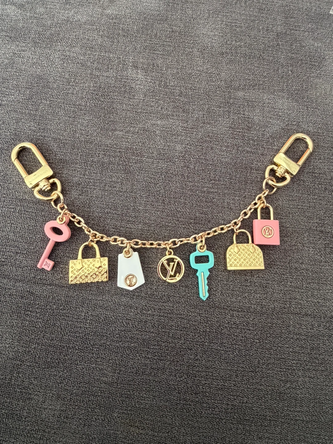 This Louis Vuitton charm features a chain with multiple decorative elements, including miniature lock and key charms in various colours. It also includes iconic LV monogram accents. The clasp is gold-toned.