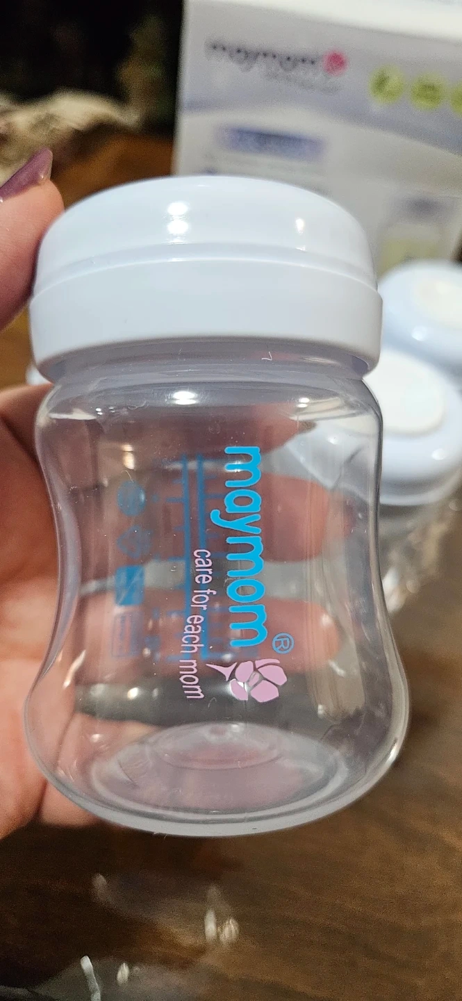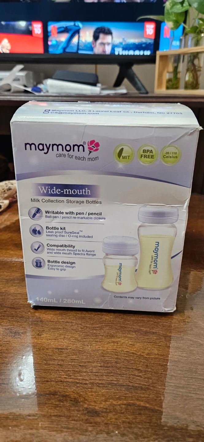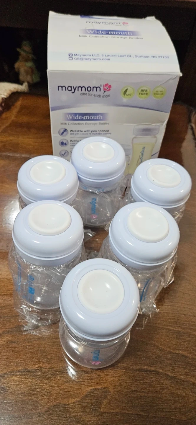 Set of 6 Maymom wide-mouth milk collection storage bottles. Compatibility with Avent and wide-mouth bottles is stated.Unused.