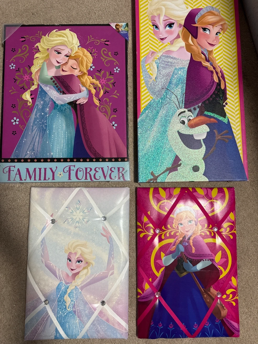 Four decorative frames featuring Elsa and Anna from Disney's Frozen. Two frames are vibrant, glittery prints of the sisters with Olaf, and the other two are fabric display boards with ribbons and gems for photos. Perfect for a child's room!each $15