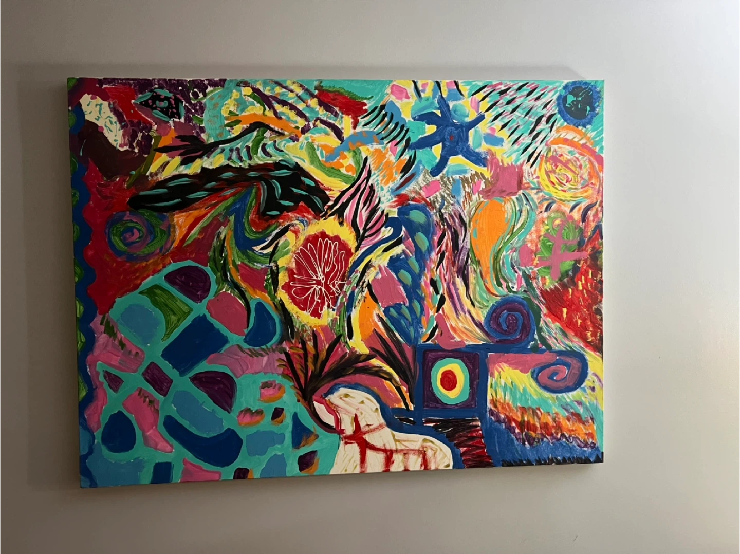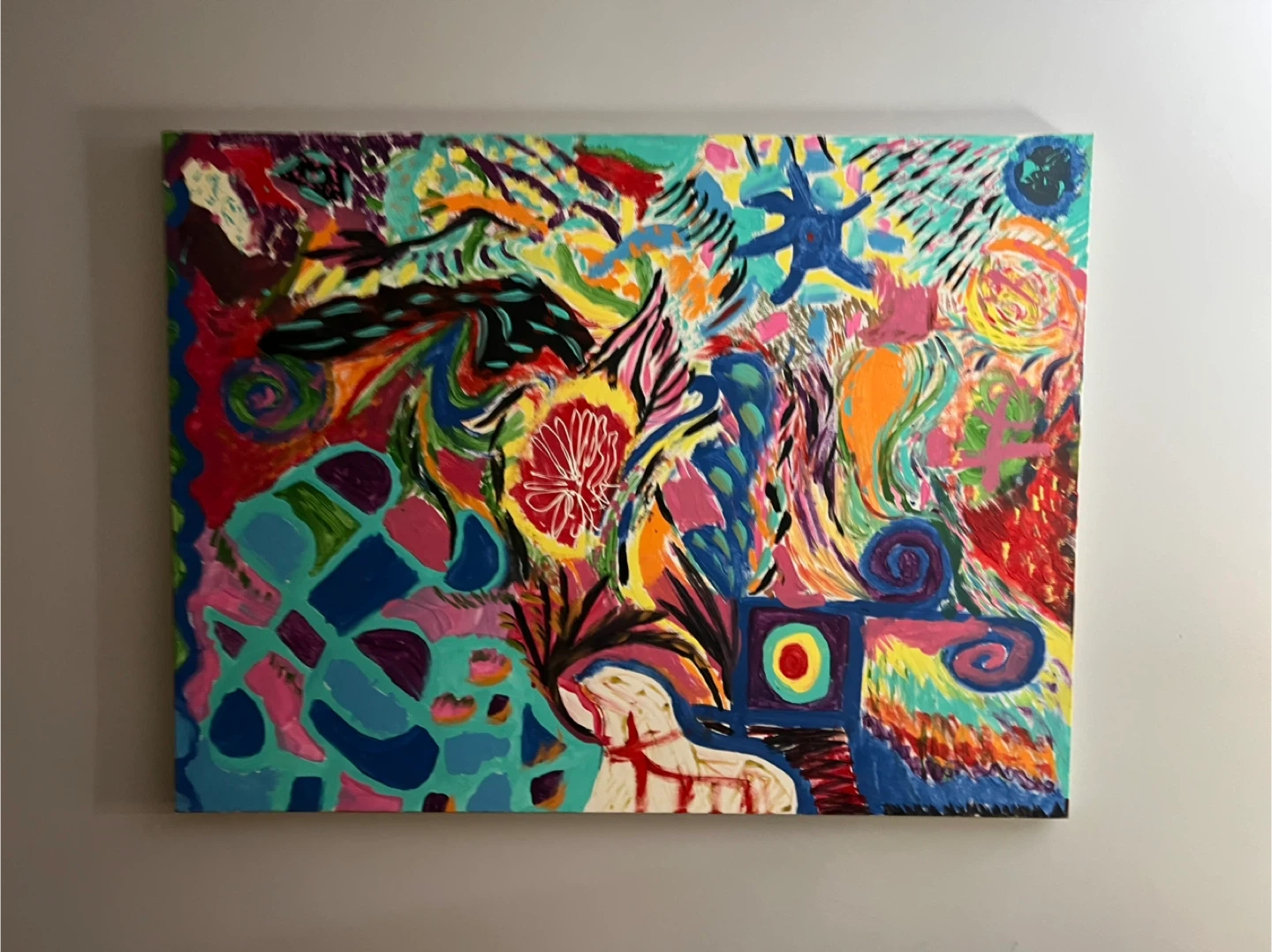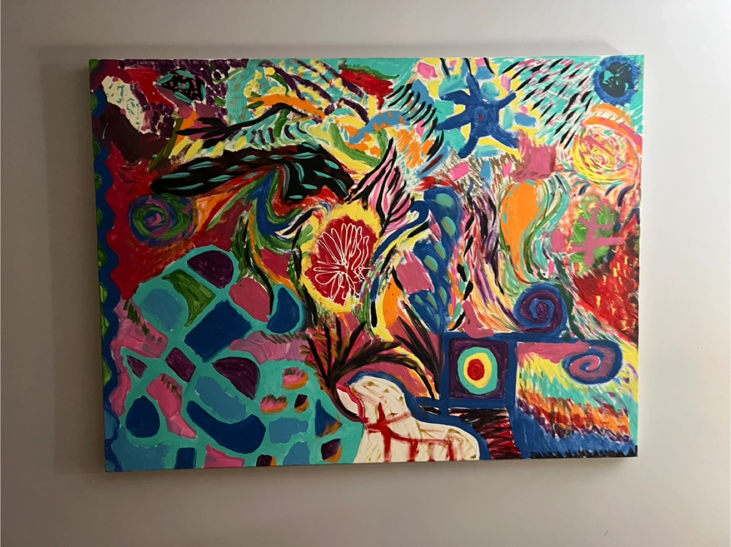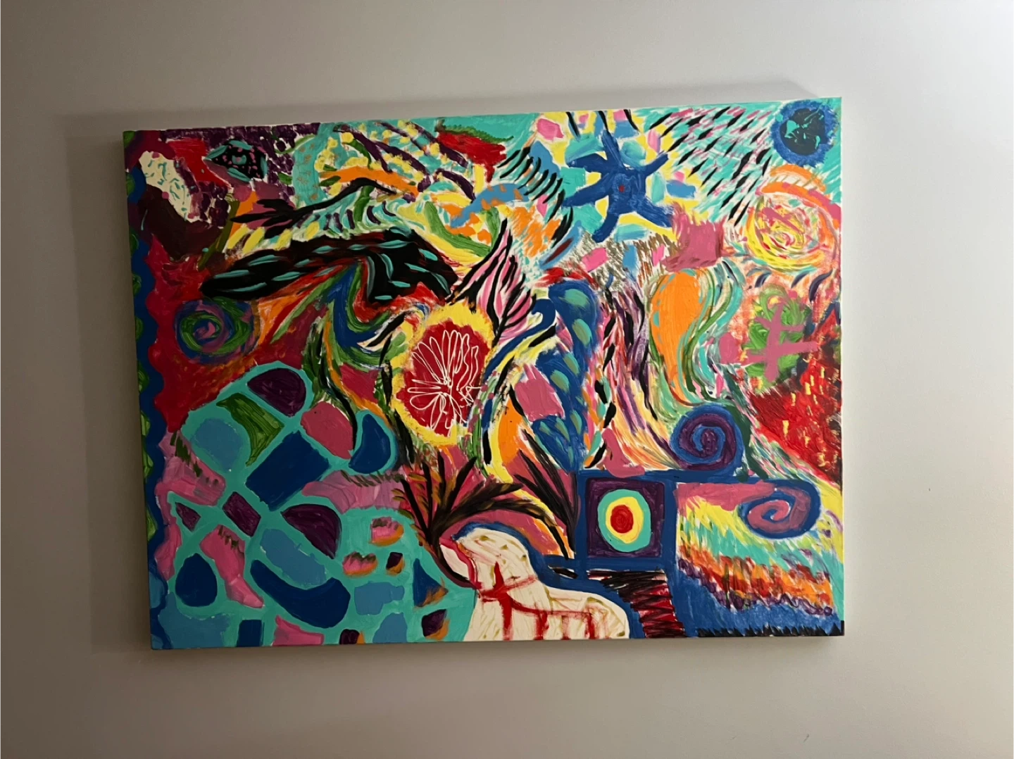 This is a colourful abstract acrylic painting on canvas. It features a dynamic composition with bold strokes and various shapes. It's ready to add a pop of energy to any room!