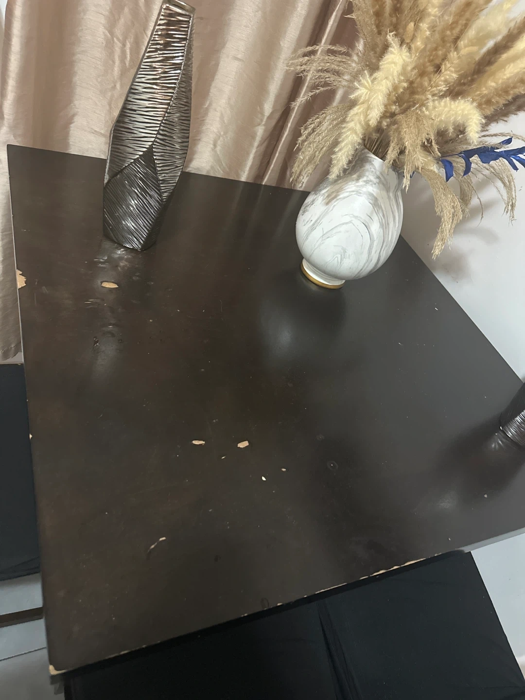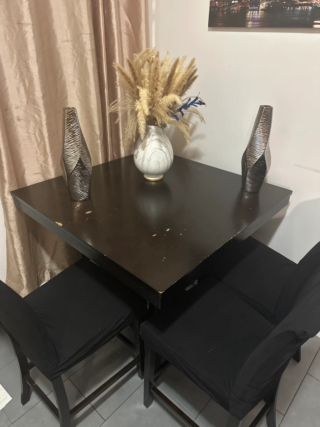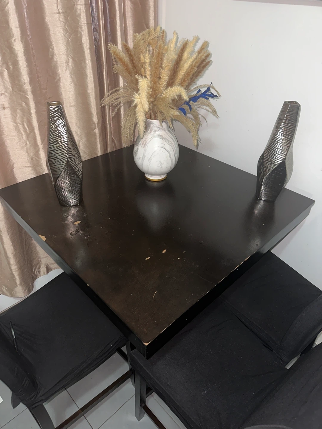 Selling a used square dining table with three chairs. It's a great set for a smaller dining space. There are some signs of wear on the table top, as shown in the pictures, but the chairs are in good condition. Perfect for a cozy dining area!