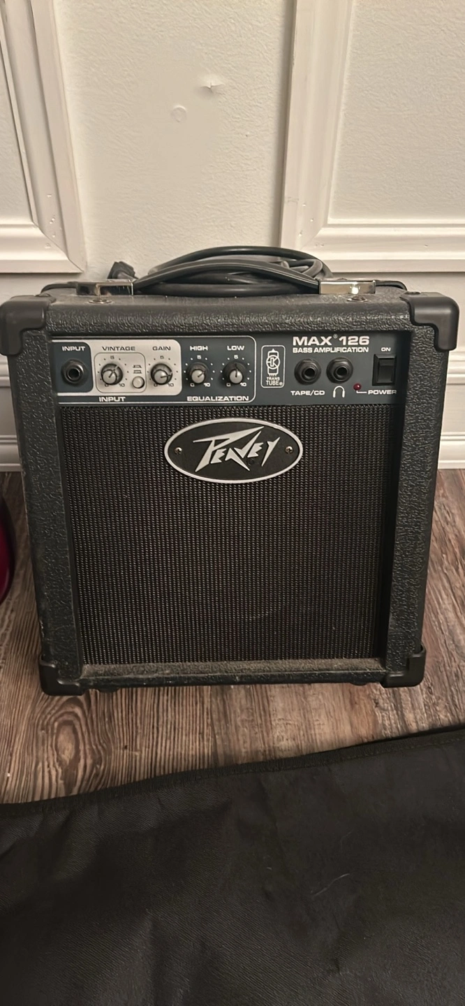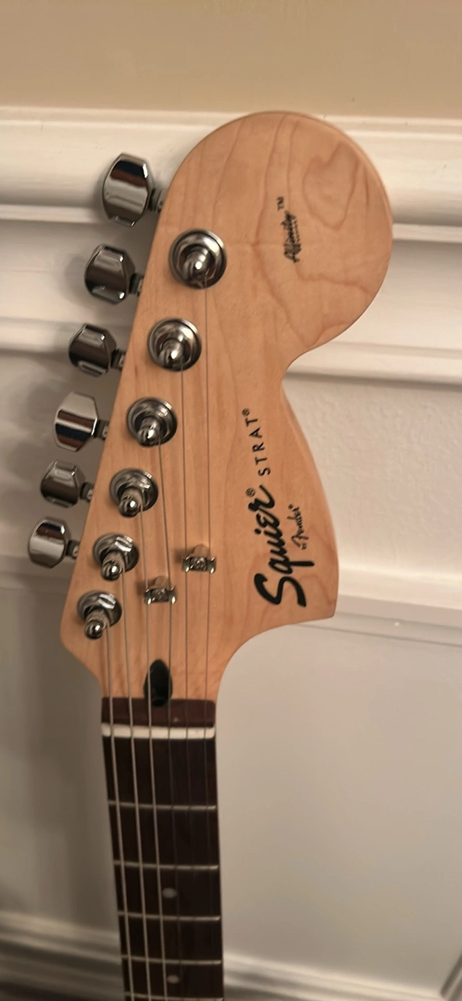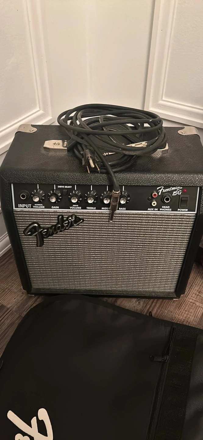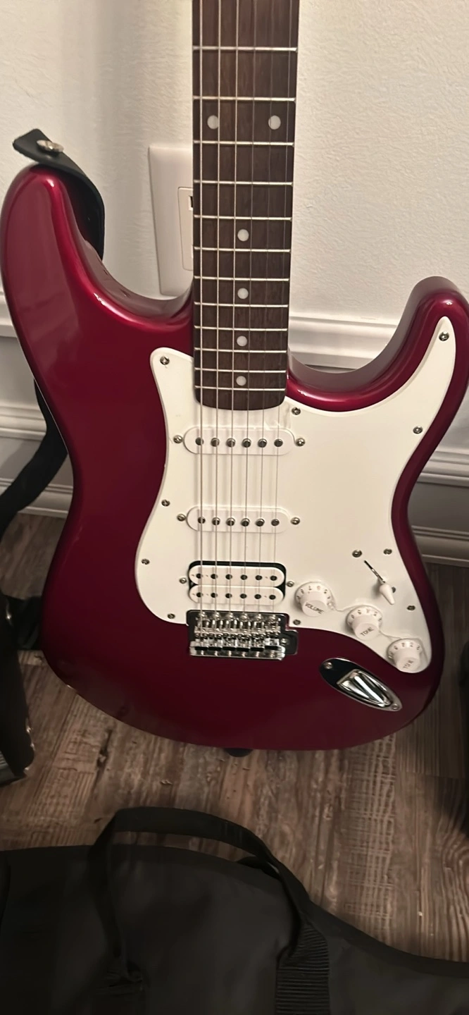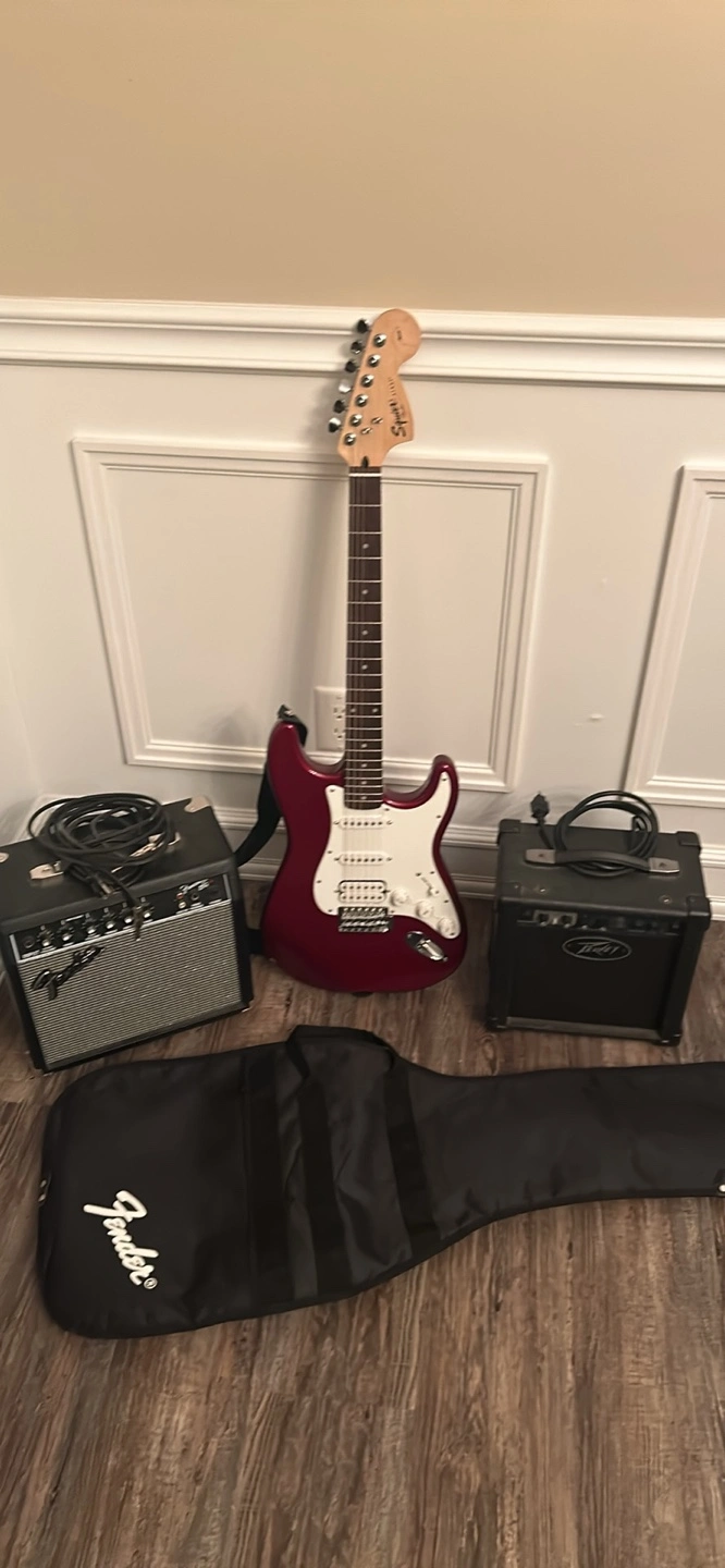 Red Squier Strat electric guitar, Fender Frontman 15G amplifier, and a black Fender gig bag with cable. Your choice of amp, only one comes with guitar