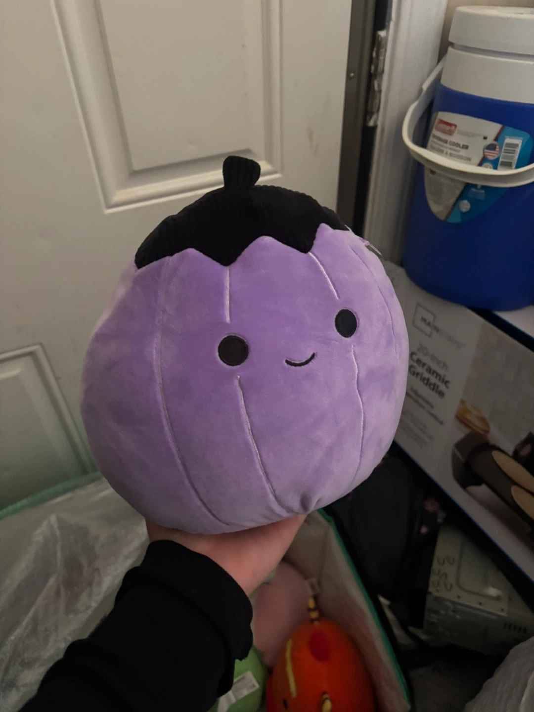 65Here's a cute and cuddly Squishmallow plush! This one is shaped like a plum purple aubergine (eggplant) with an adorable face. It's in great condition and ready for a new home