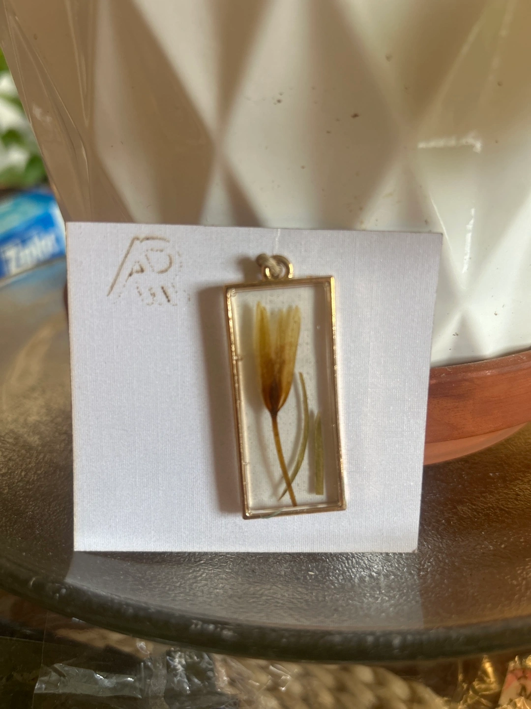 A charming handmade pendant necklace featuring a delicate flower encased in resin. It's a unique piece that adds a touch of nature to any outfit. Perfect for anyone who loves botanical jewelry!