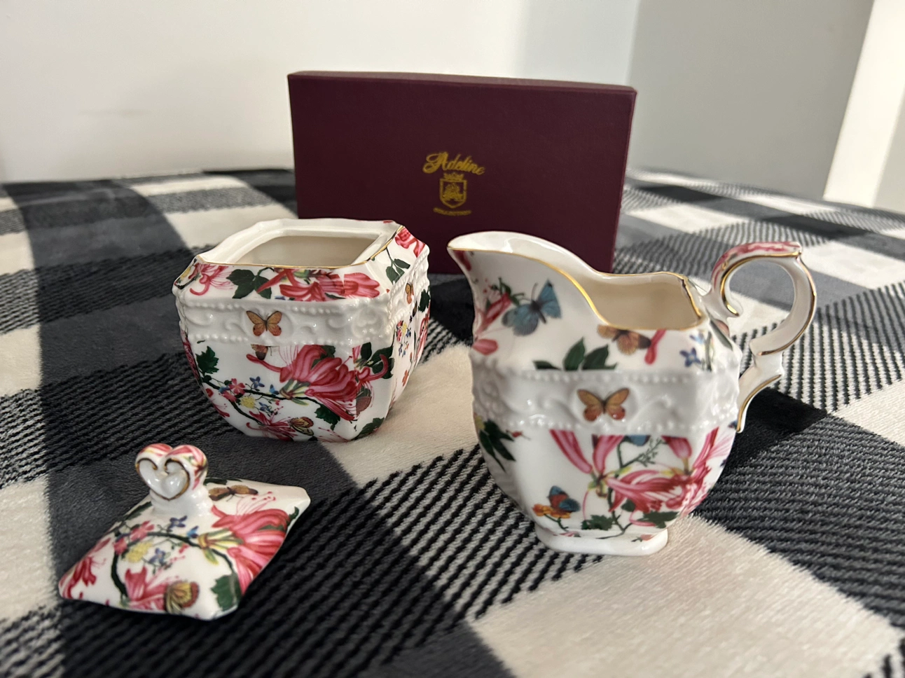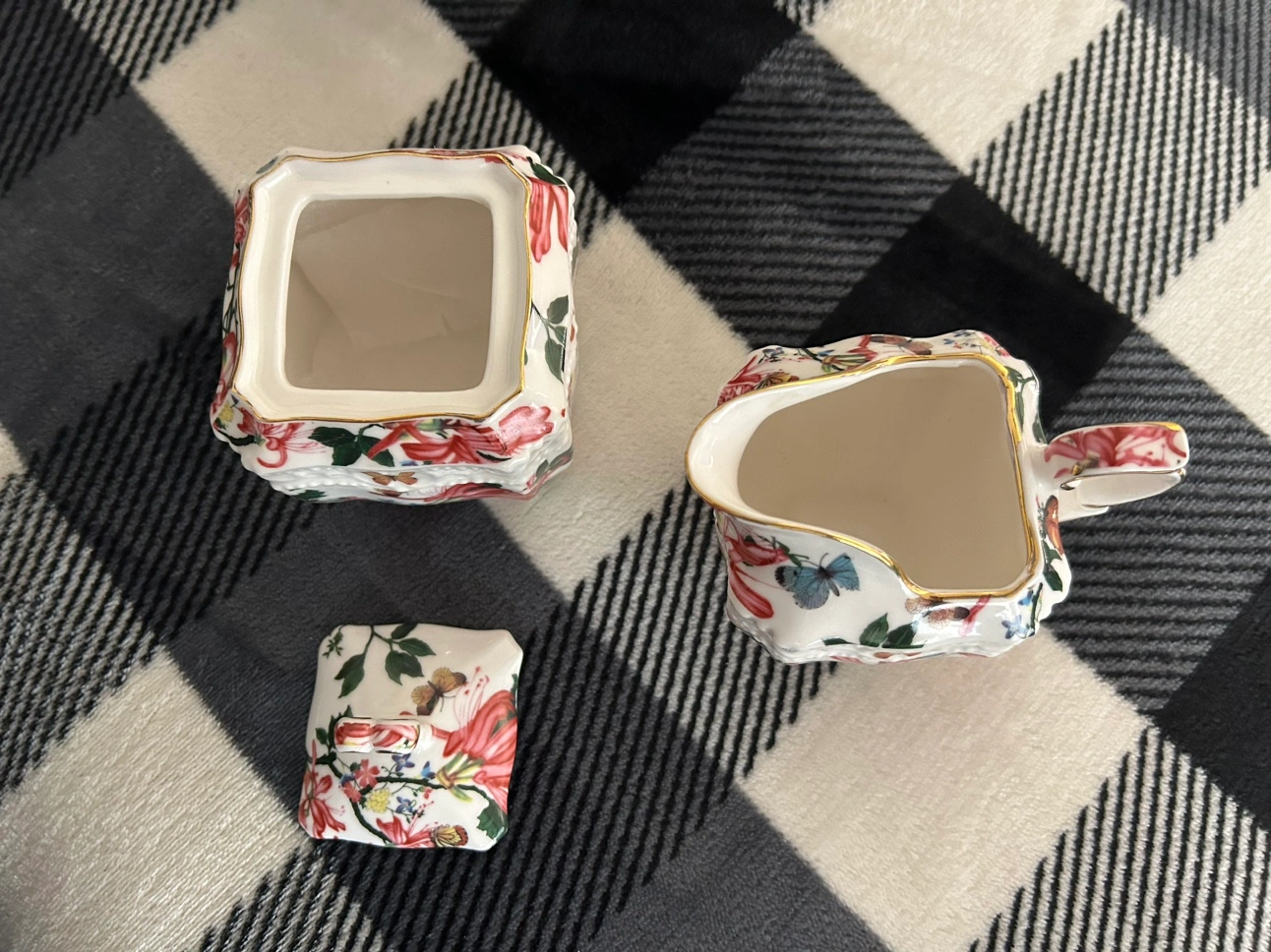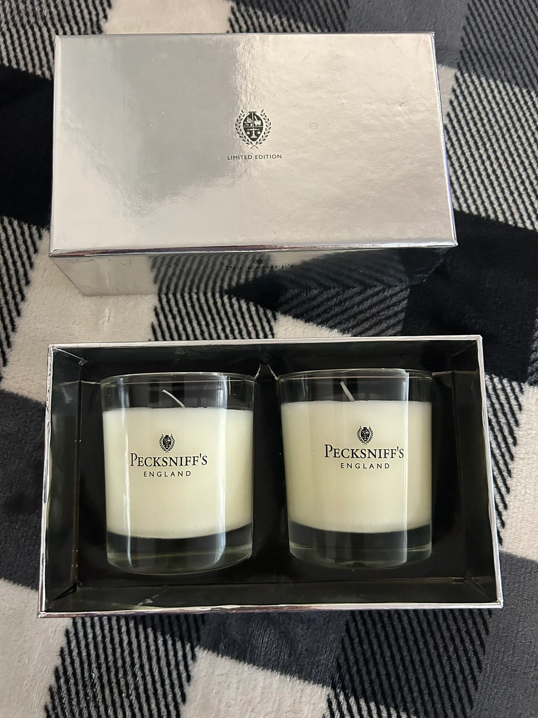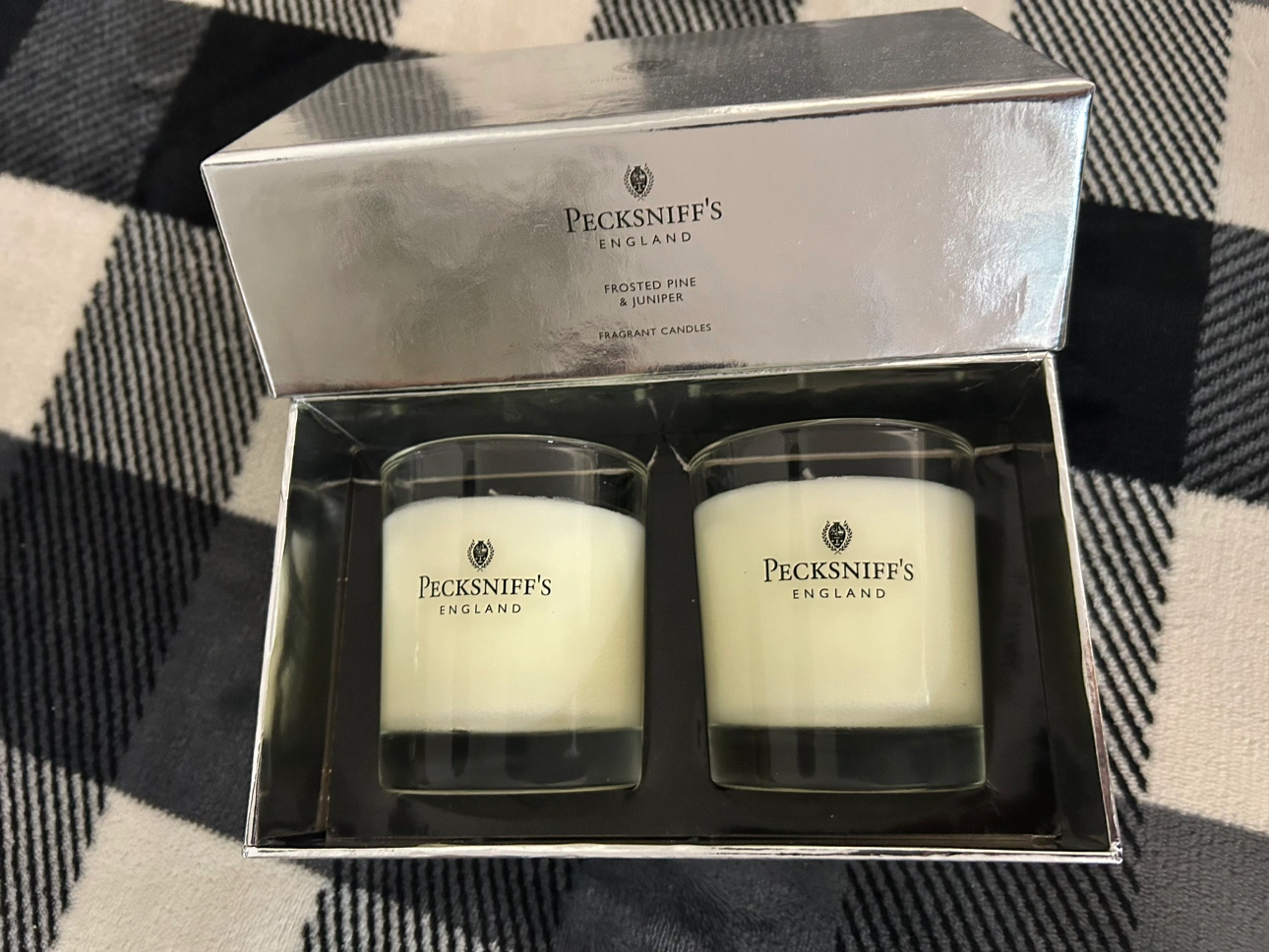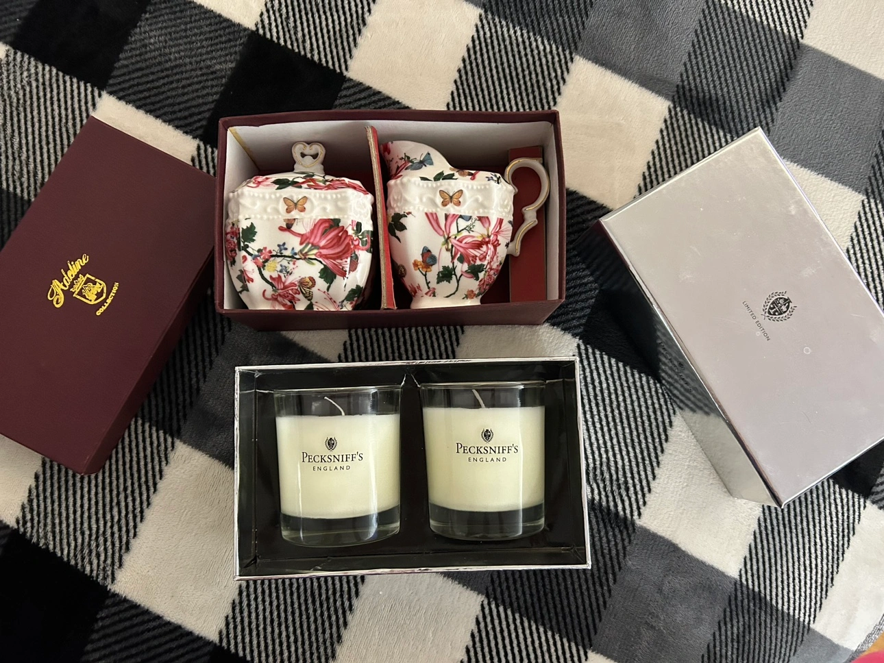 Received as a gift and haven’t used them. Tea set, milk and sugar holders. Pecksniff’s England 110g candles x 2, frosted pine & juniper cent.