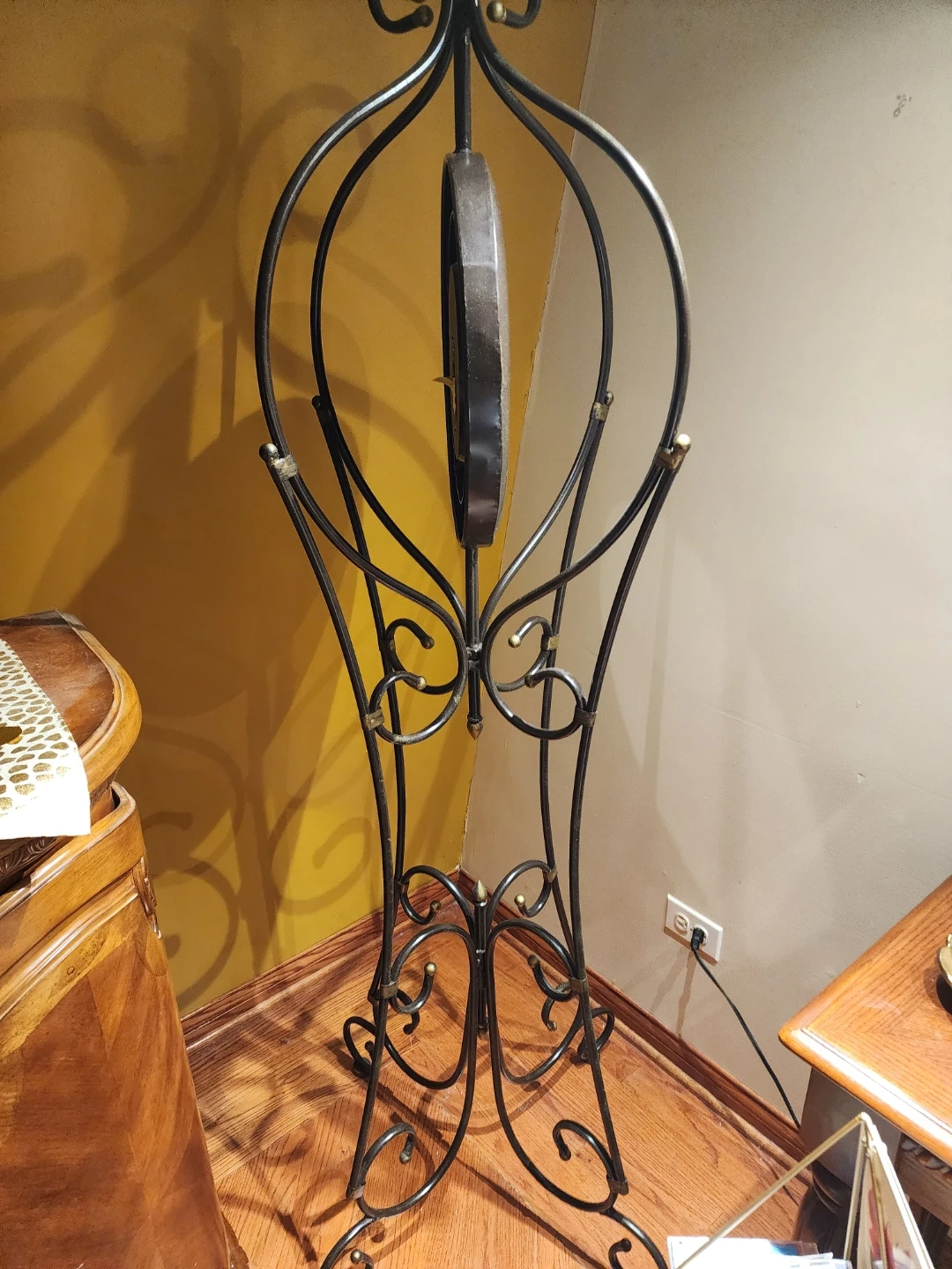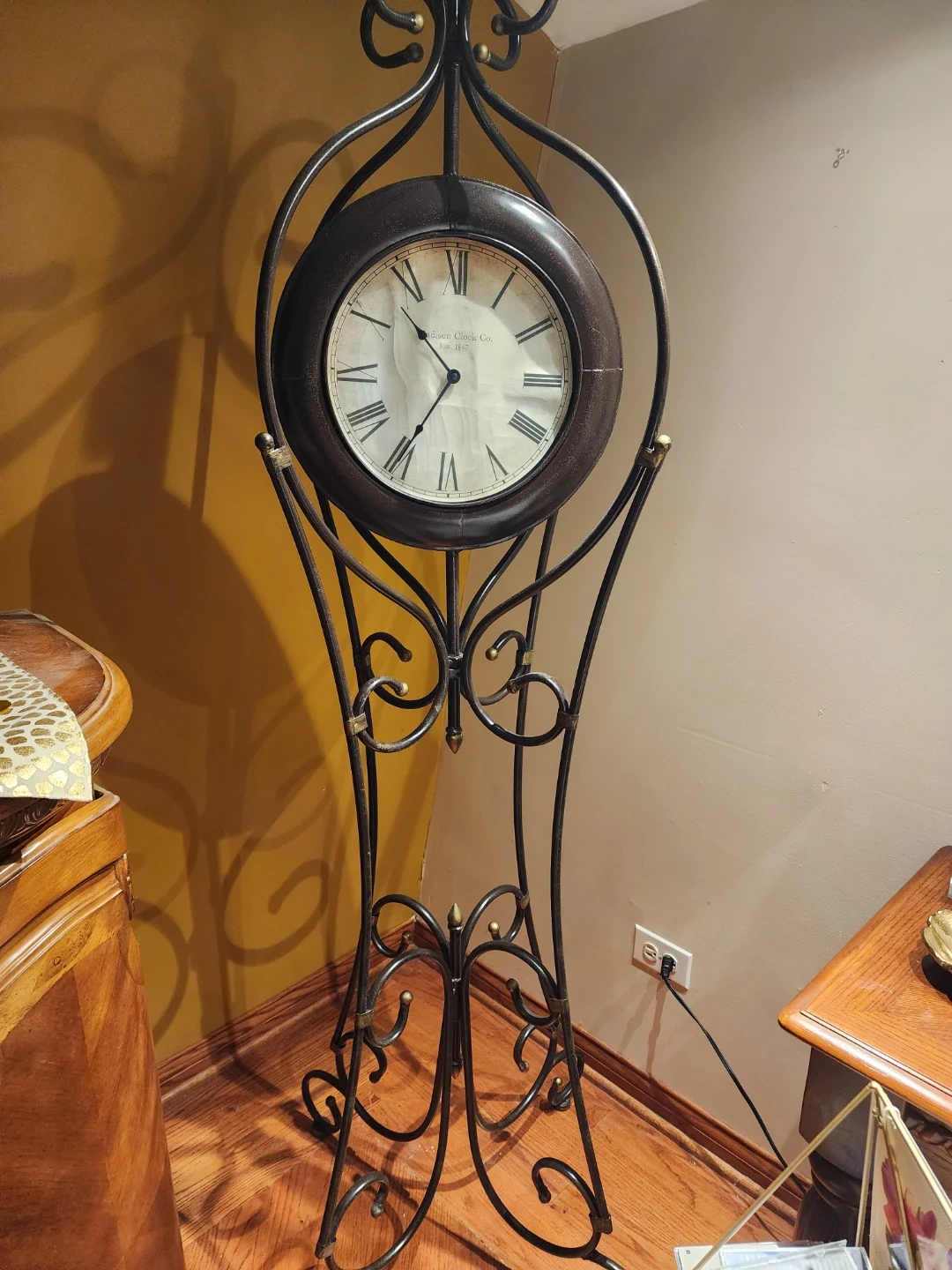 This decorative standing clock features an ornate metal frame with an antique-style clock face. It's perfect for adding a classic touch to any room. The clock has Roman numerals and a dark metal casing.