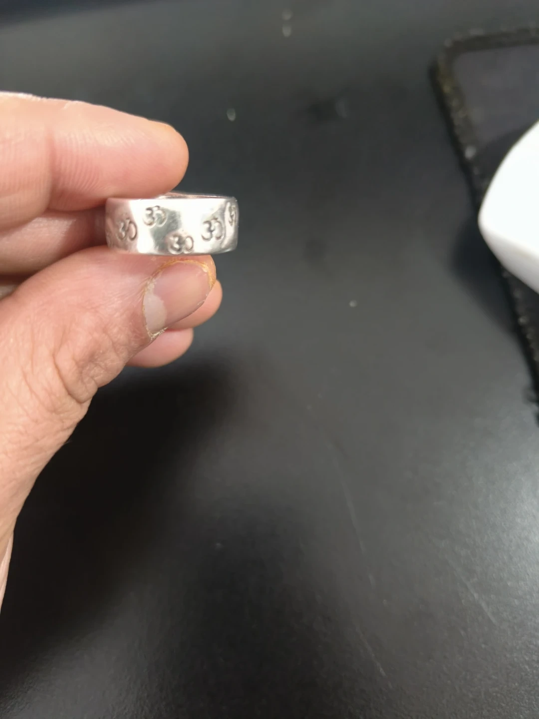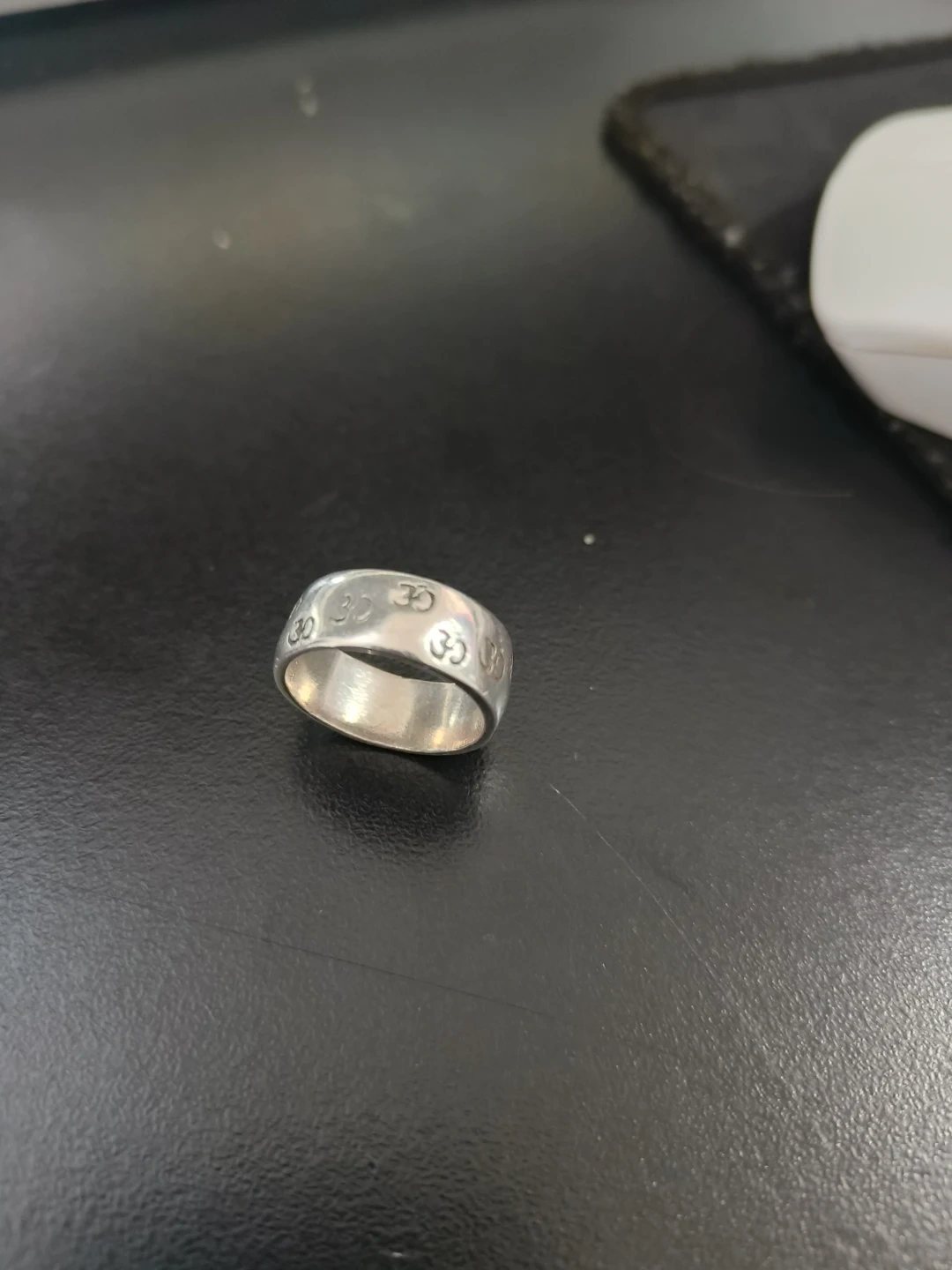 This is a sterling silver ring featuring an OM symbol design. The band is silver coloured. It's a nice piece for everyday wear. Prefer Cash, and want to settle today. Thank you!