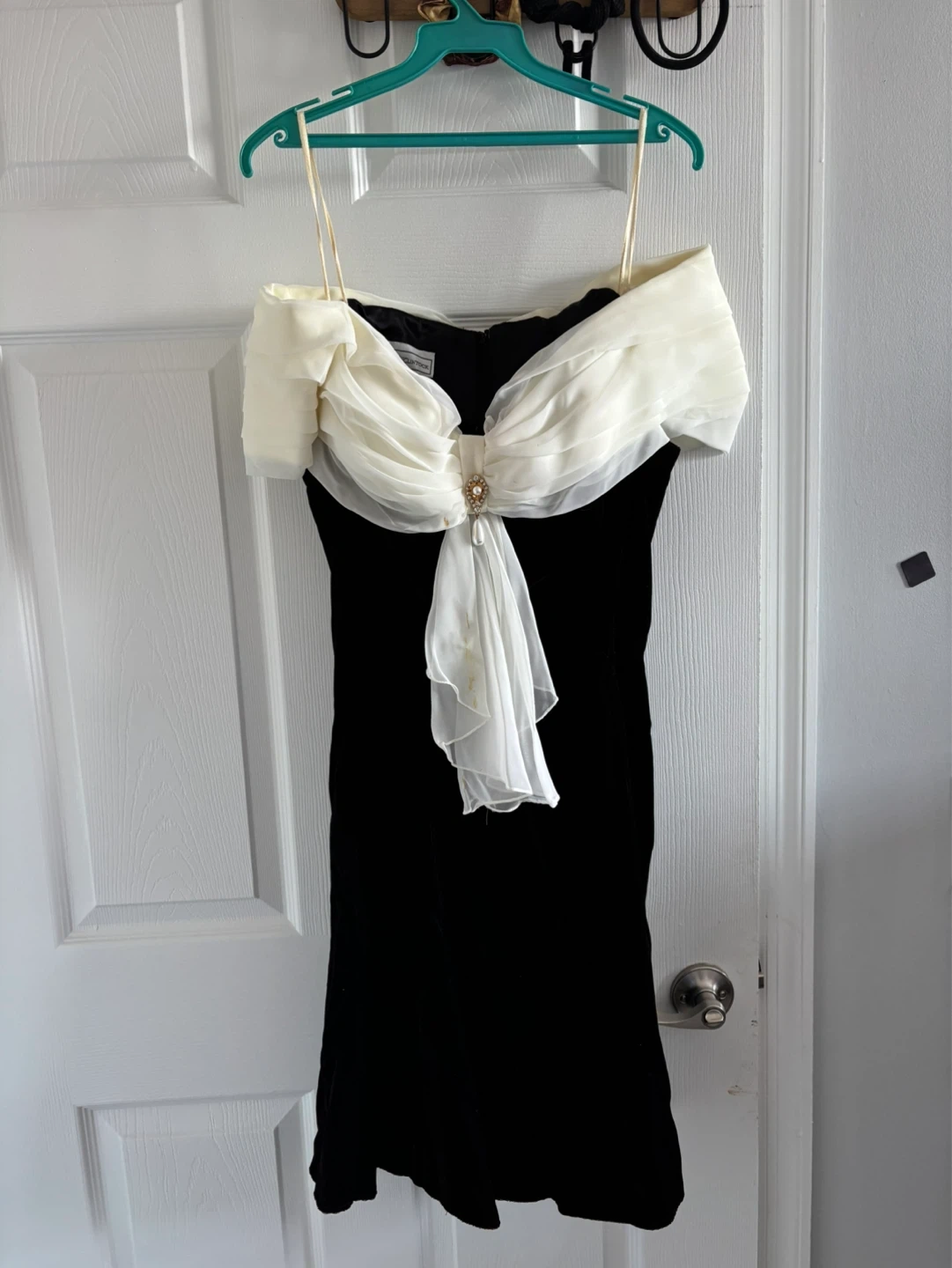 Elegant black velvet dress by Jessica McClintock Gunne Sax. Features a stunning off-the-shoulder neckline with a draped chiffon overlay and jeweled accent. This dress is made with a rayon blend fabric. Perfect for formal occasions! Little stain on the overlay