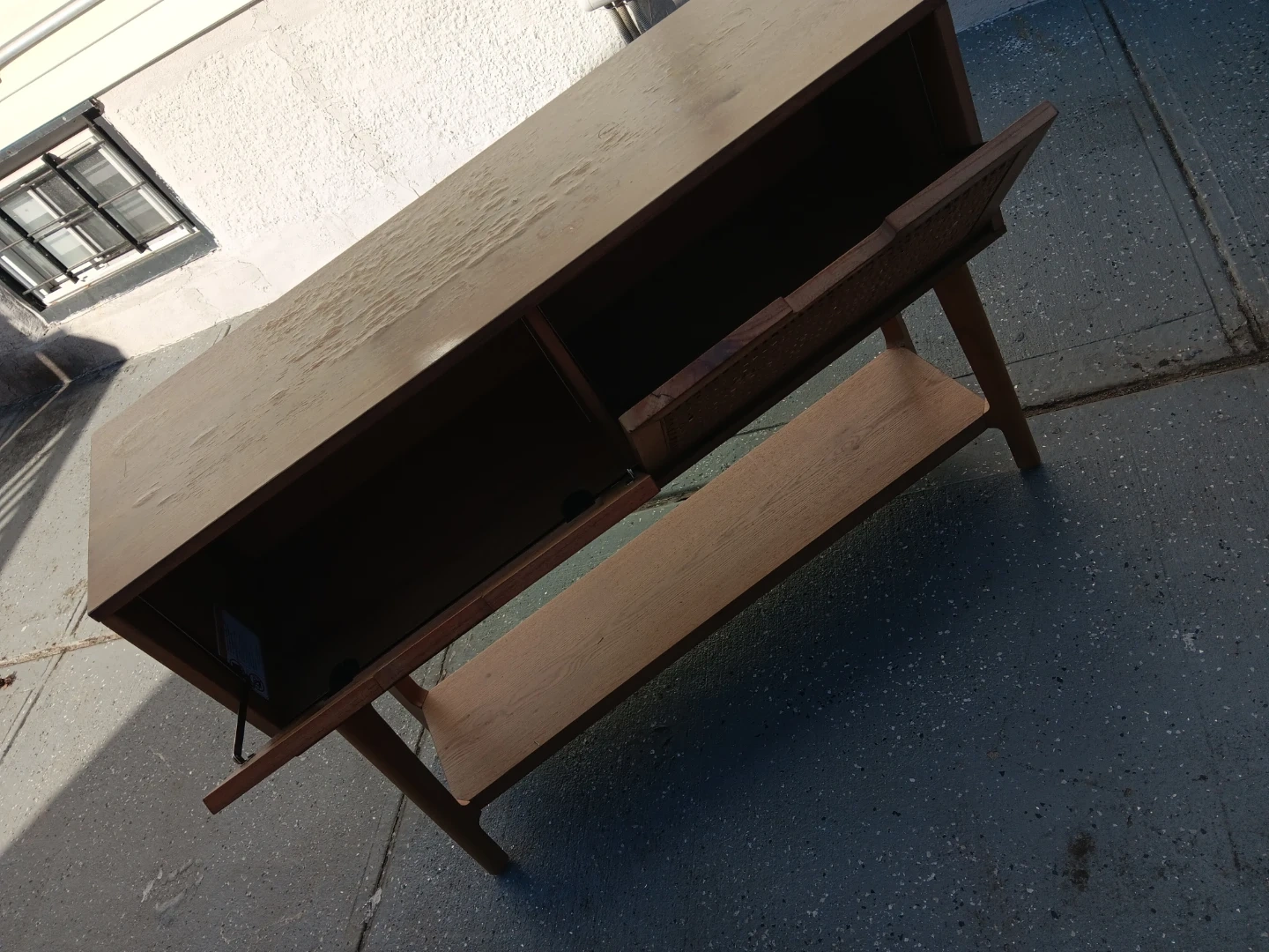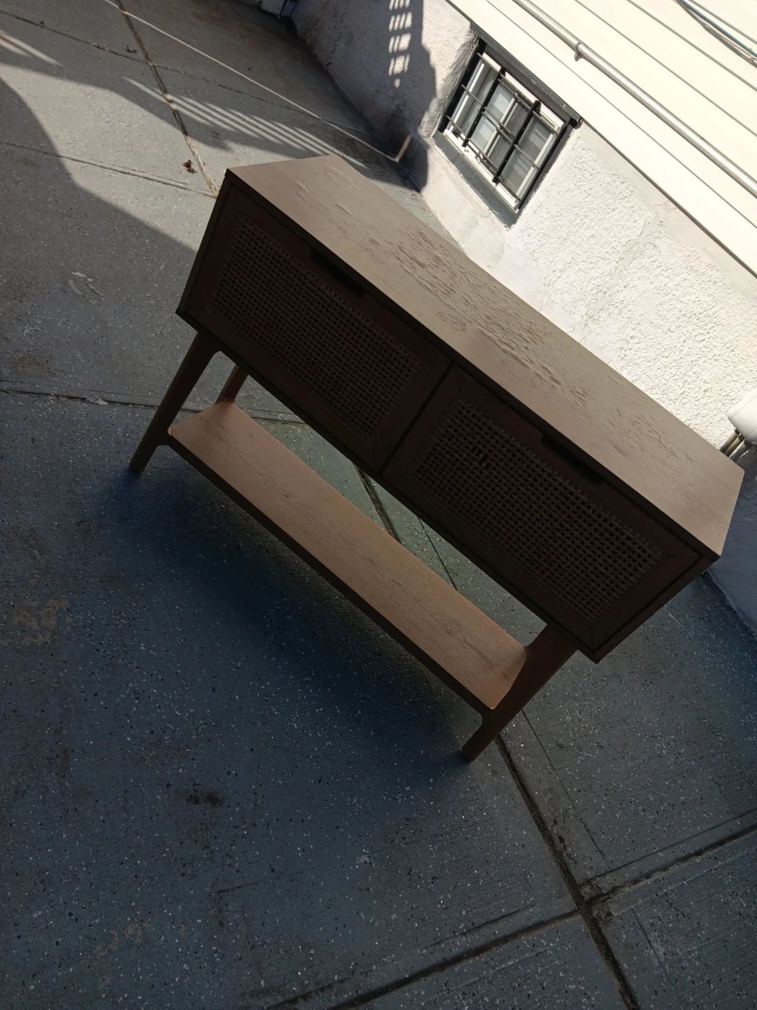 Selling a wooden console table. It features a shelf and two drawers with woven fronts. Perfect for an entryway or living room!