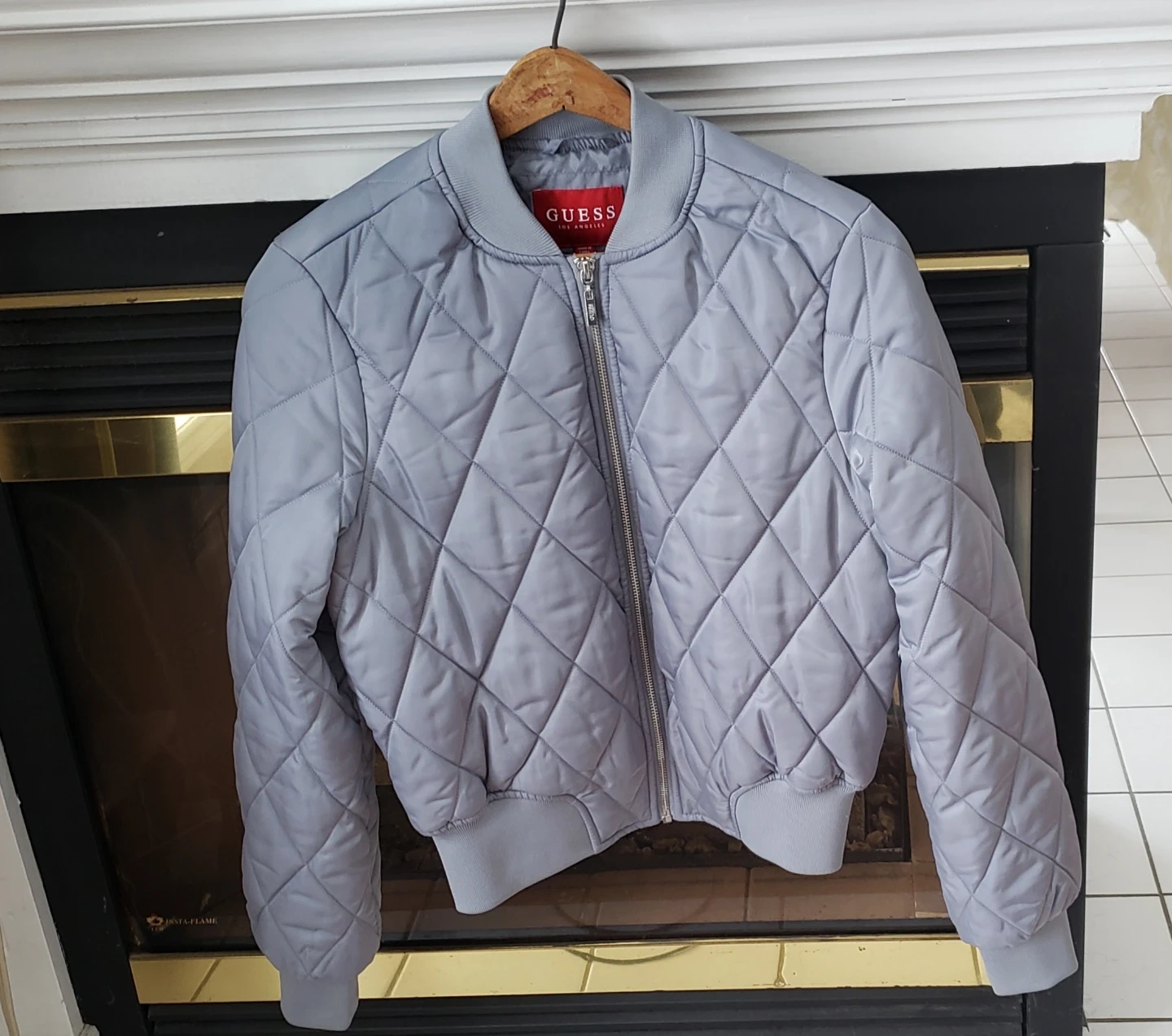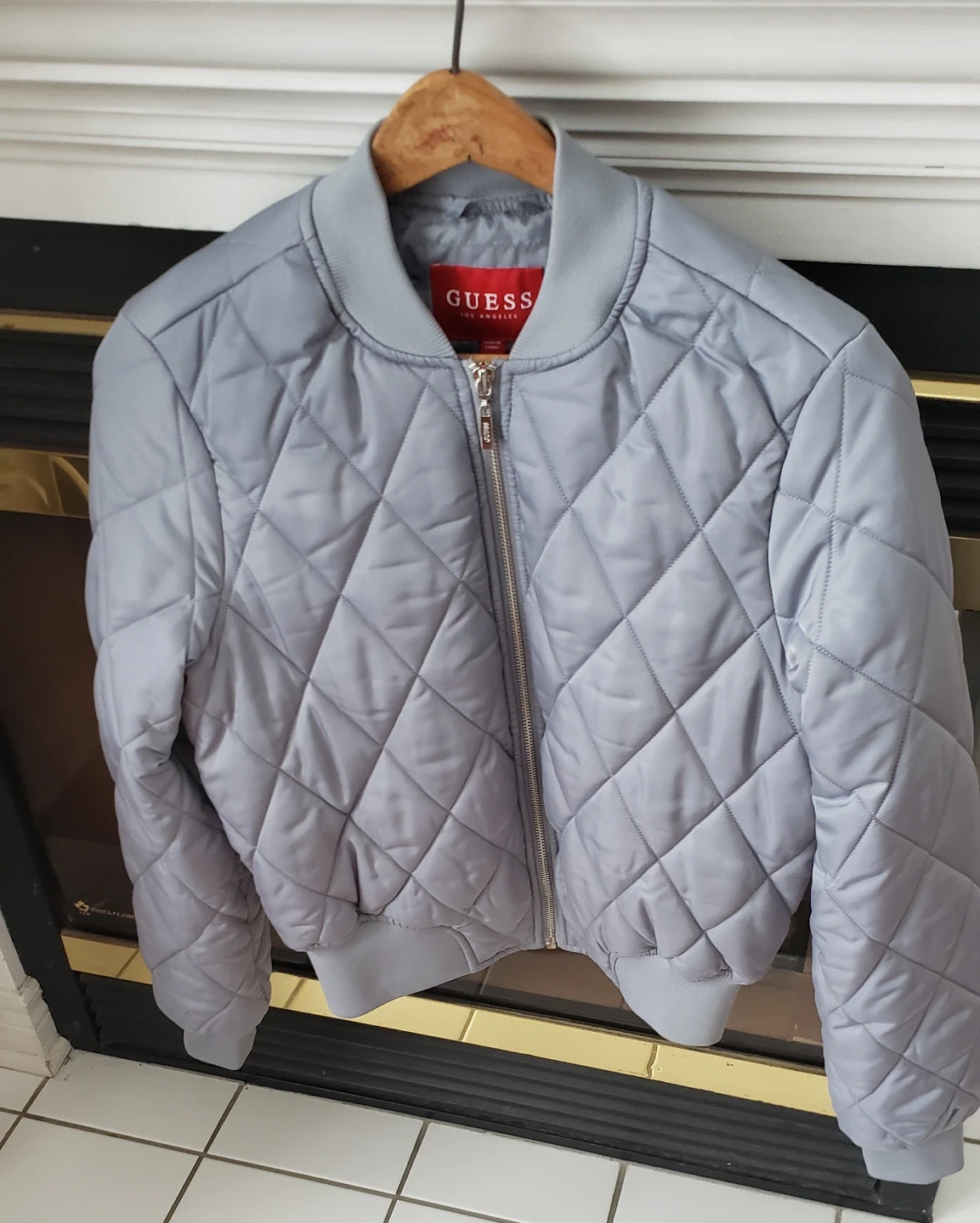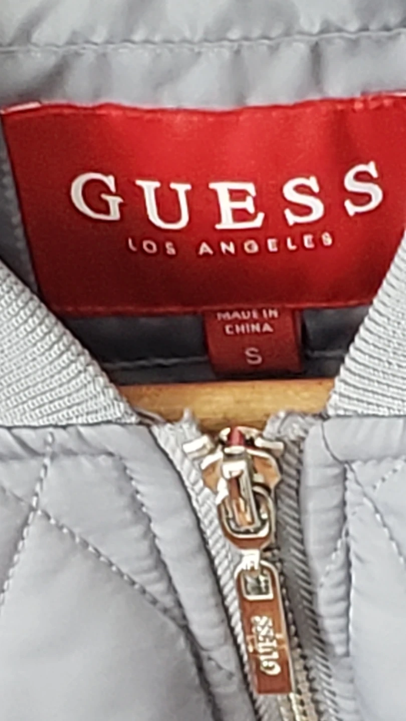 This is a grey quilted bomber jacket from Guess. It's a size small. The jacket has a full zip closure. Worn only 2 times!