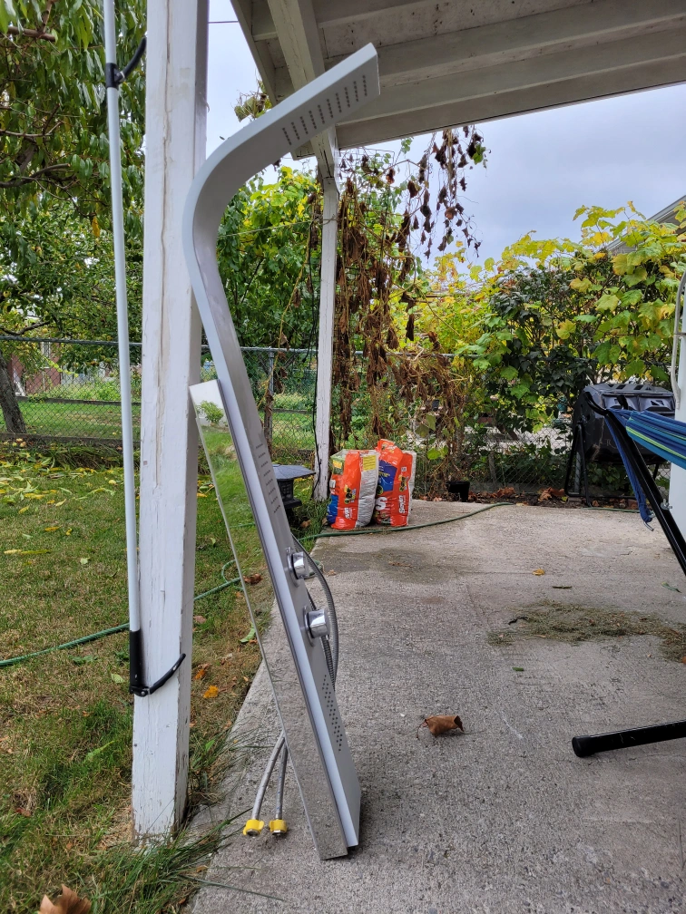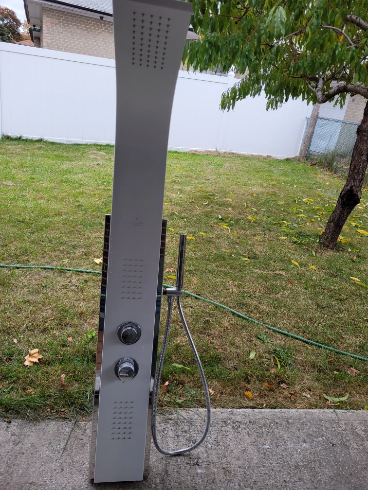 This shower unit comes with a shower head, handheld shower head, and two knobs for controlling water temperature and pressure. Used but in working condition.