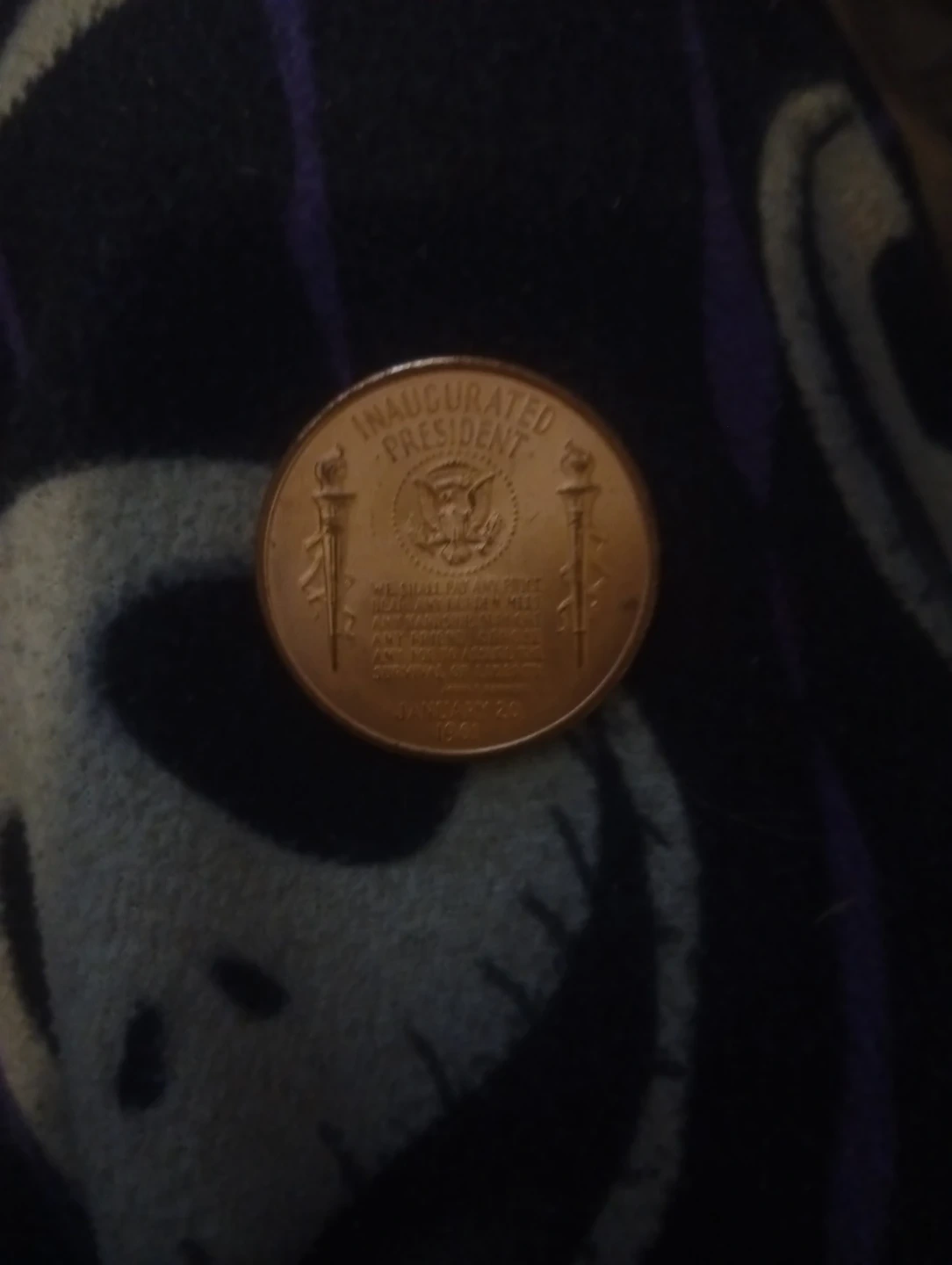 This is a coin commemorating President John F. Kennedy's inauguration. It reads 'Inaugurated President' and shows the date January 20, 1961. A portion of Kennedy's profile is also visible on the coin.
