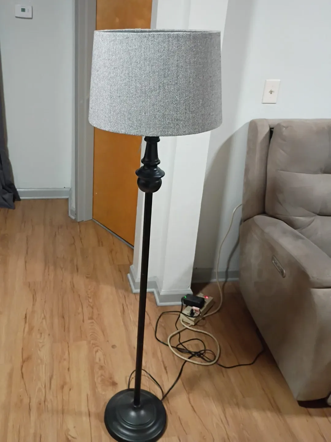 This floor lamp features a dark metal pole and base with a light gray fabric shade. The shade has a subtle herringbone pattern. It's a stylish lighting option for any room! It has a tall, slim profile.